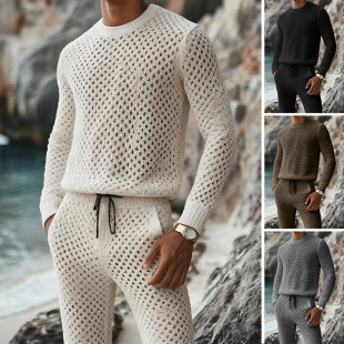 欧美跨境秋冬季新款休闲修身圆领长袖长裤男士毛织套装批发男装