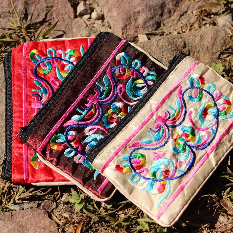 에스닉 스타일 자수 새틴 휴대용 소형 가방 동전 지갑 양면 자수 손 동전 지갑 멀티 컬러스토어 가기