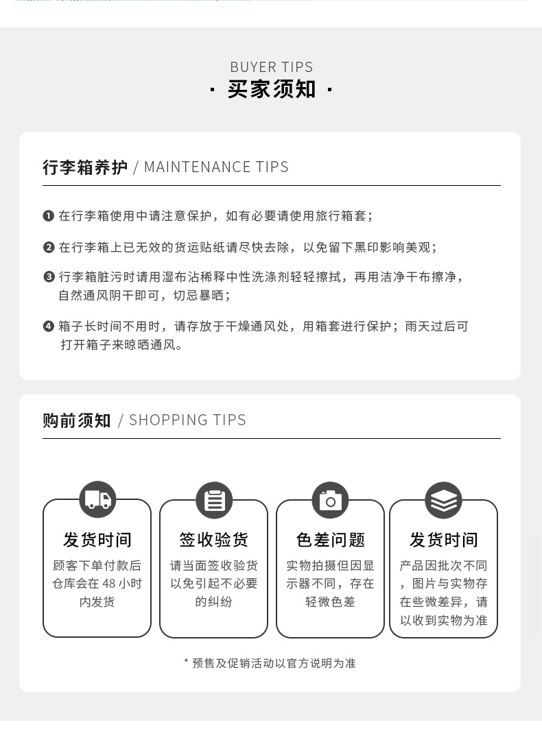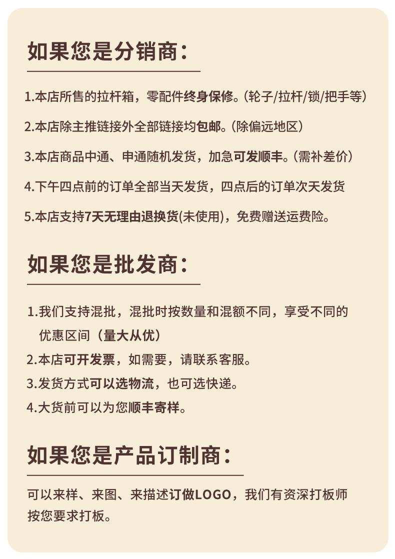 3、关于配件:所有20寸箱子都没有侧手提和侧脚钉,因生产批次不同会有某些款式的配件不同(包括但不止:轮子,拉链,内部结构,拉杆,提手,锁、里布),请介意的亲们慎拍哈,沟通尽量问清楚!