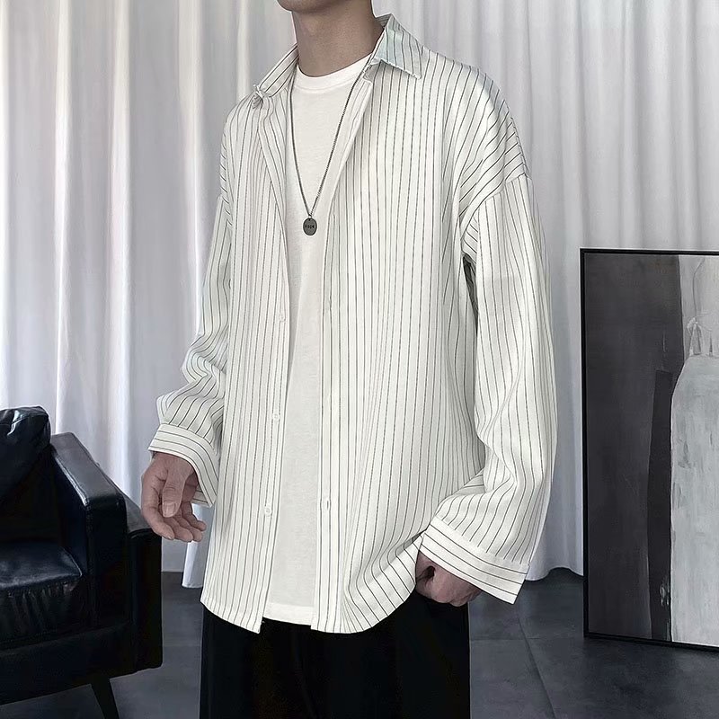 스트라이프 셔츠 코트 남자의 홍콩 스타일 일본식 캐주얼 느슨한 옷 유행 검은 남자의 긴 소매 셔츠 여름 얇은스토어 가기