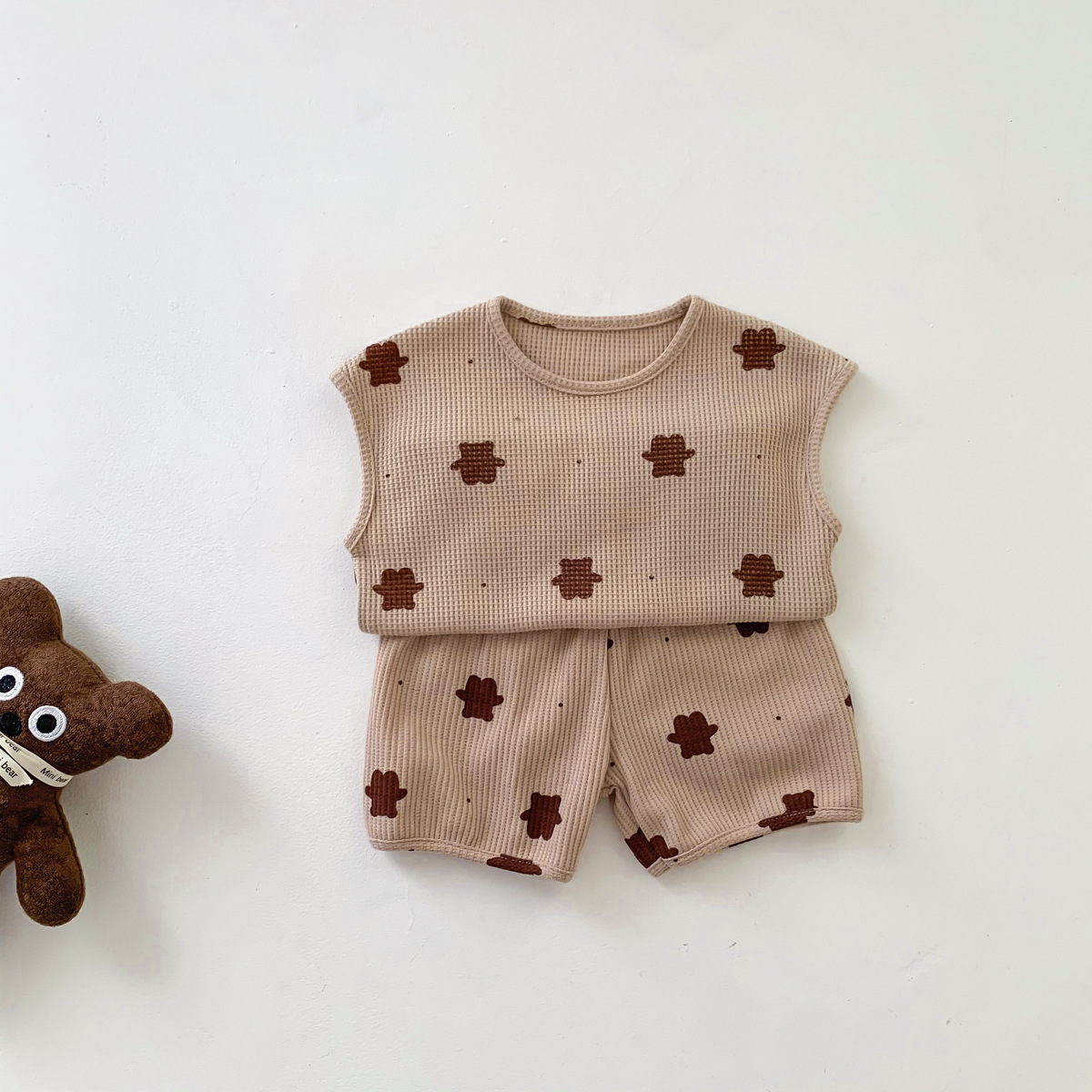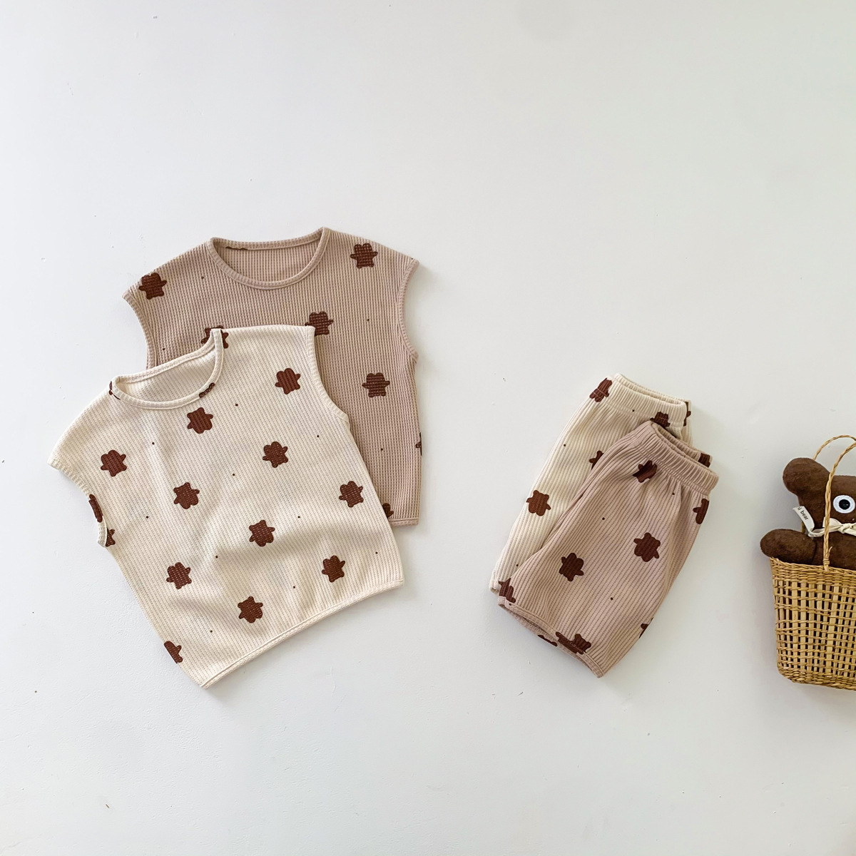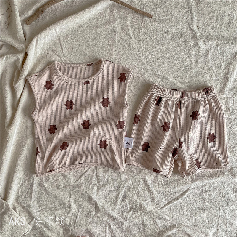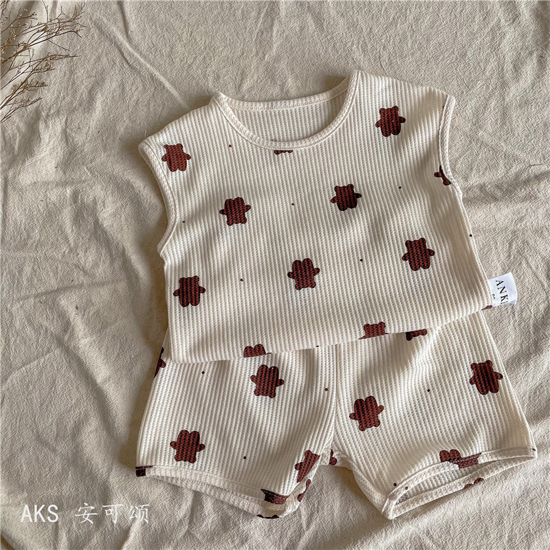 어린이 민소매 세트 한국 스타일 귀여운 인쇄 면 아기 투피스 세트 소년과 소녀 캐주얼 유행 복장 얇은스토어 가기