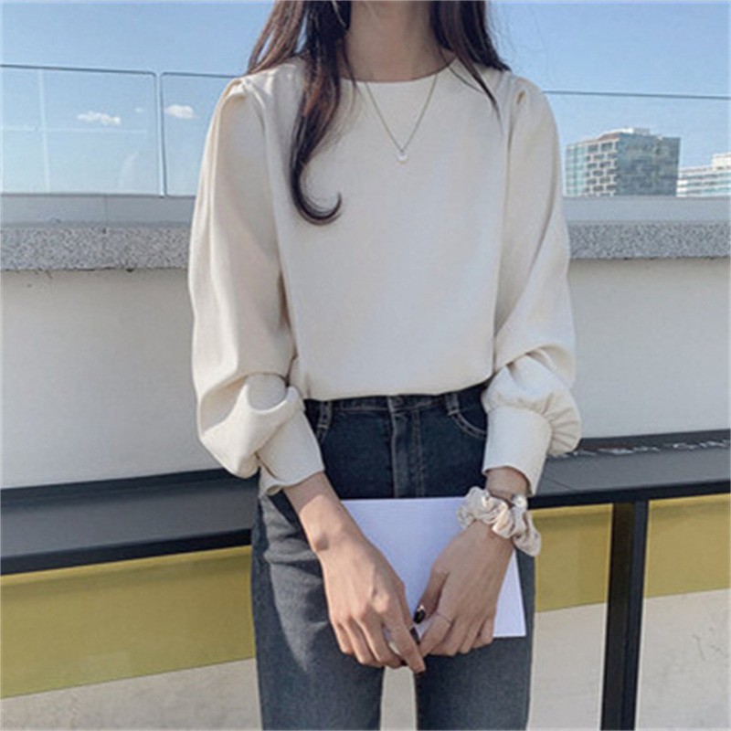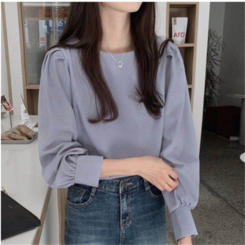 한국 세련된 가을 화이트 헤이즈 블루 크루넥 퍼프 슬리브 여성용 느슨한 나이 감소 크루넥 긴 소매 셔츠