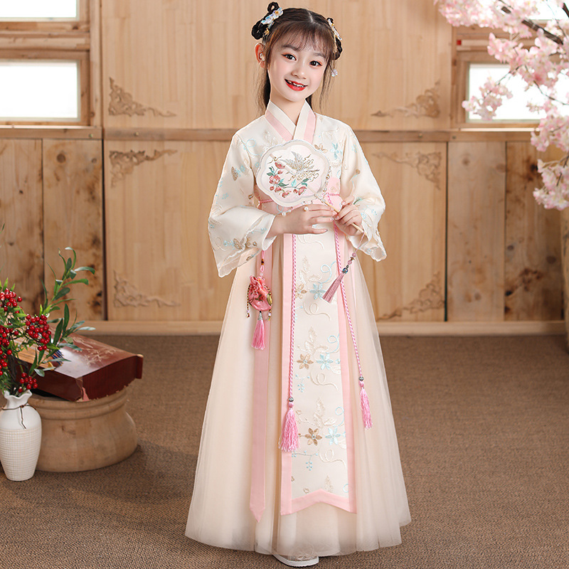 中国风女童汉服新款儿童古装春秋唐装交领粉色古风超仙小女孩长袖