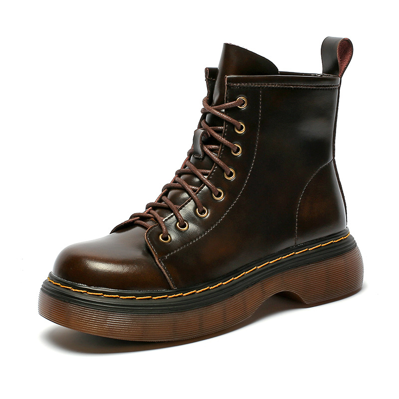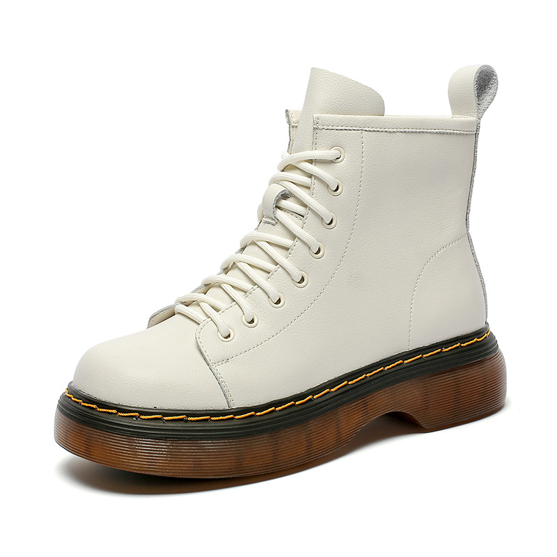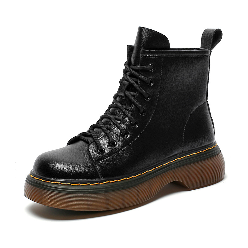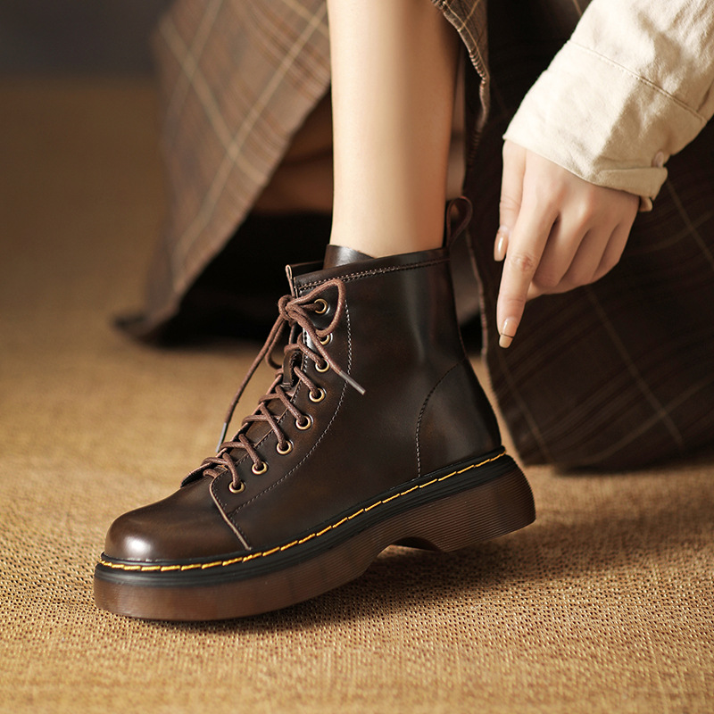 영국 스타일 유행 소가죽 마틴 부츠 여성용 2023 가을과 겨울 새로운 라운드 발가락 두꺼운 바닥 두꺼운 굽 어린이를위한 중간 굽 부츠스토어 가기