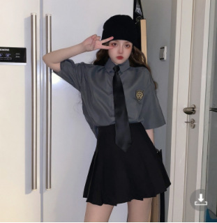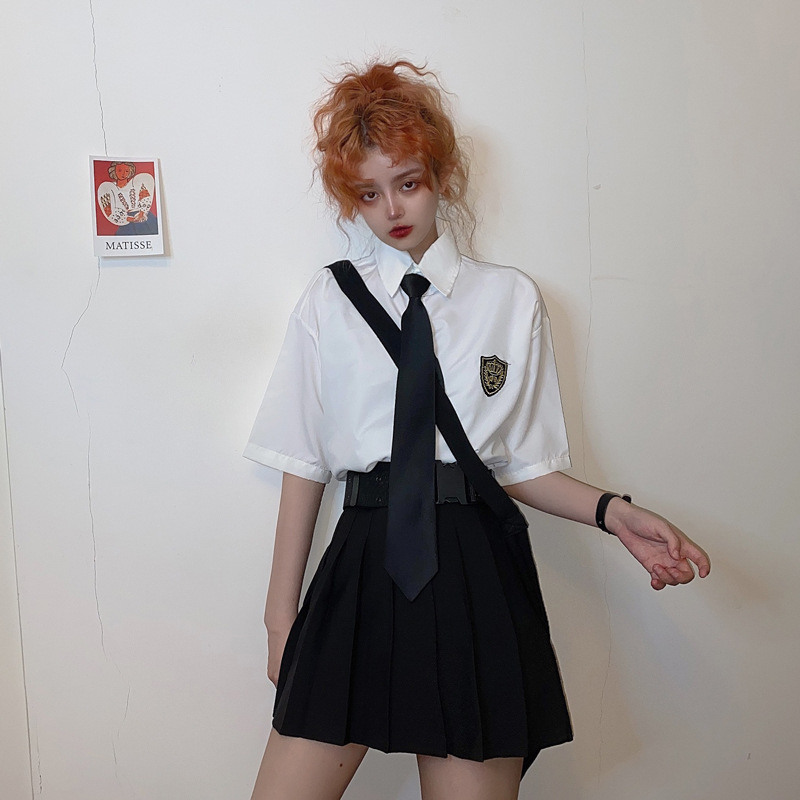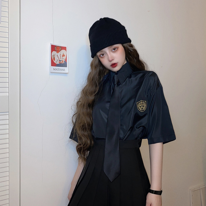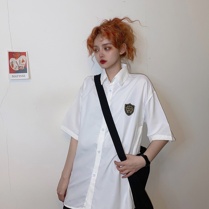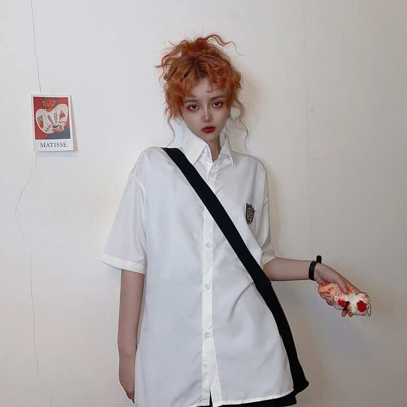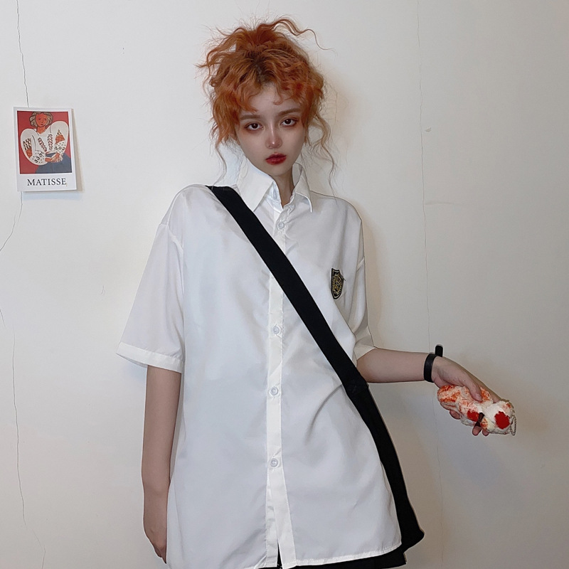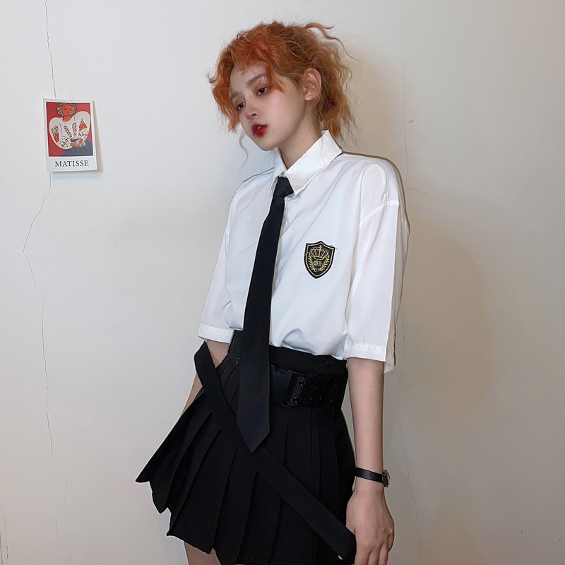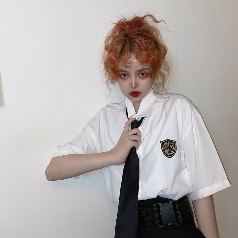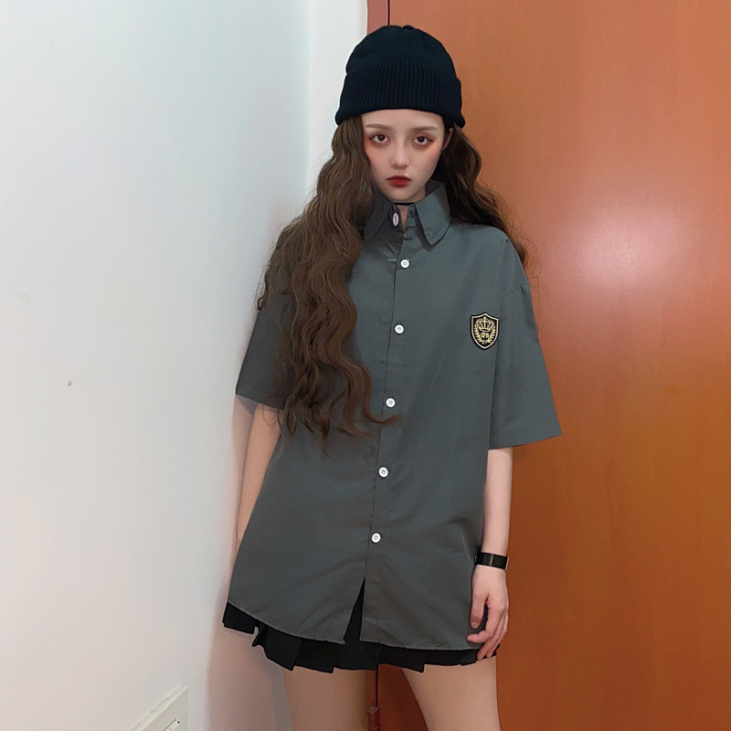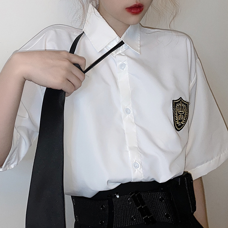 2021 여름 반팔 셔츠 여성 대학 스타일 배지 넥타이 클래스 의류 회색 흰색 셔츠 한국식 느슨한 패션스토어 가기