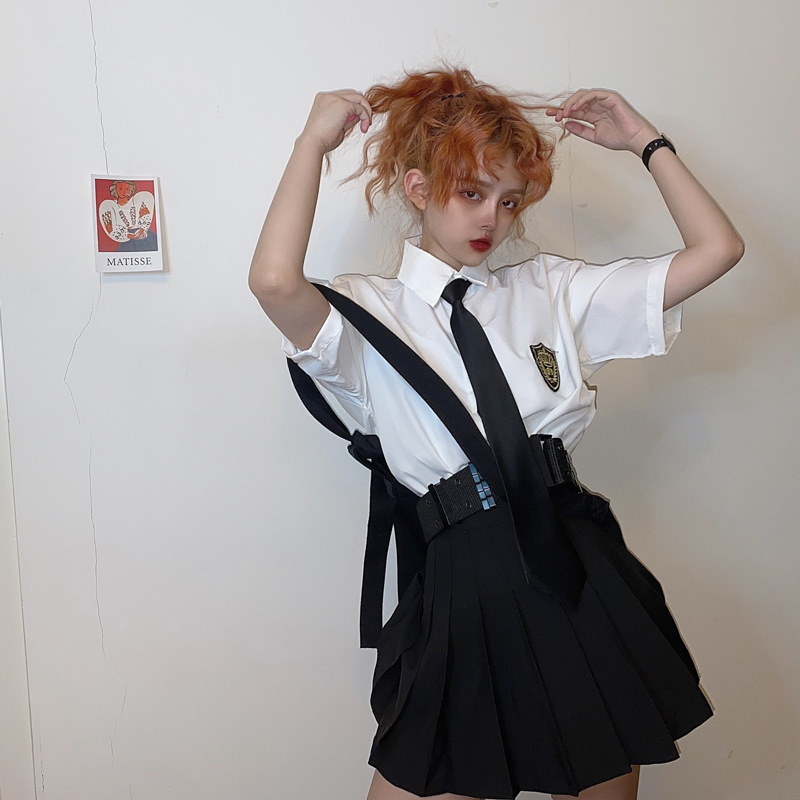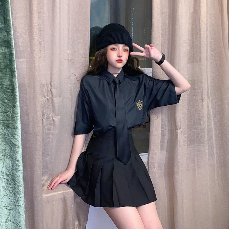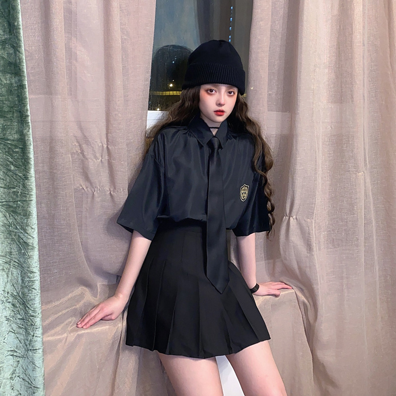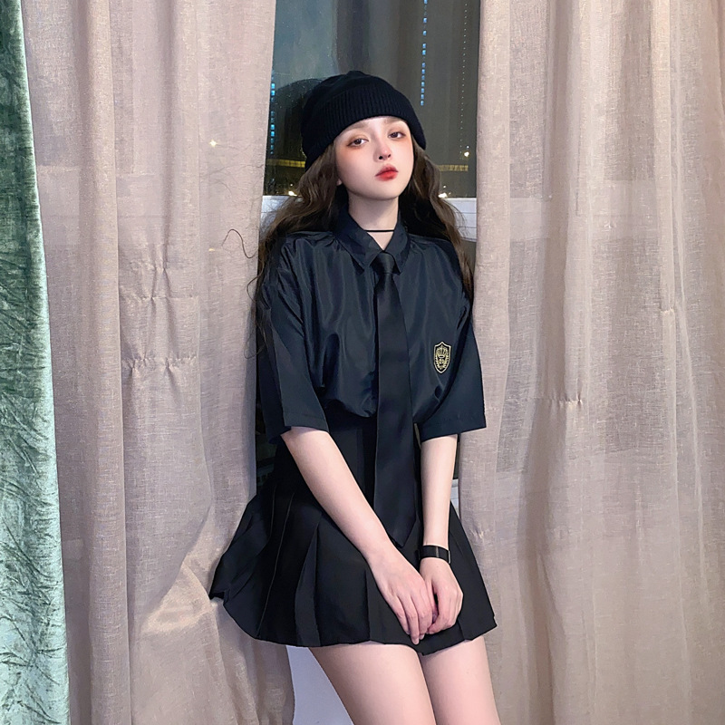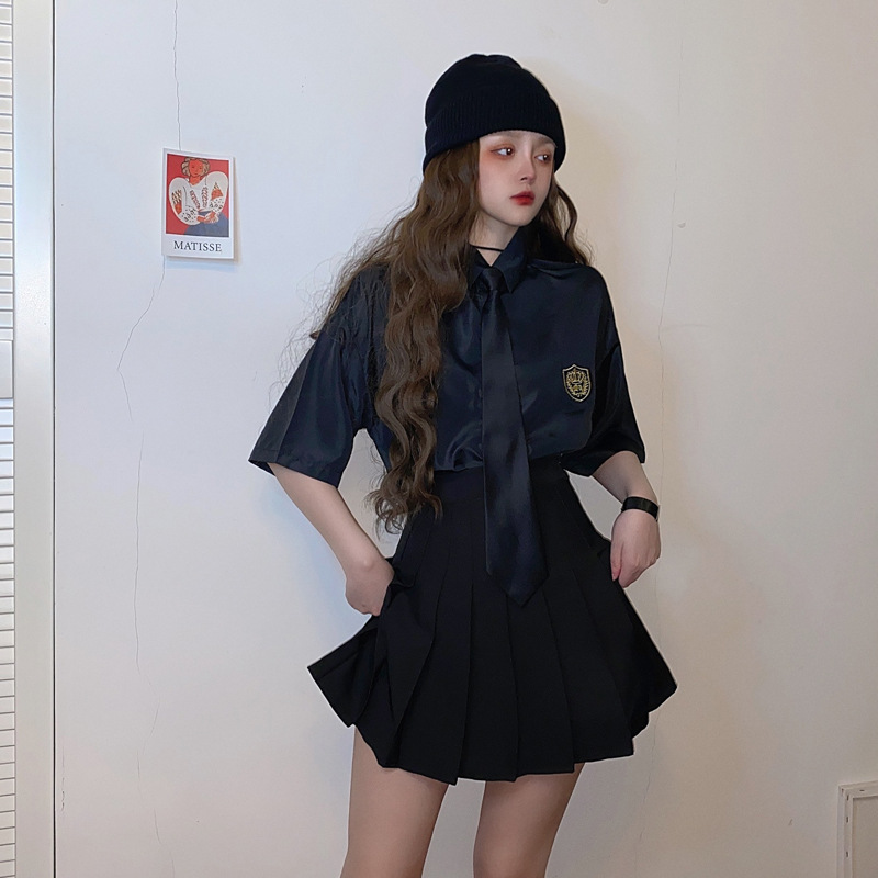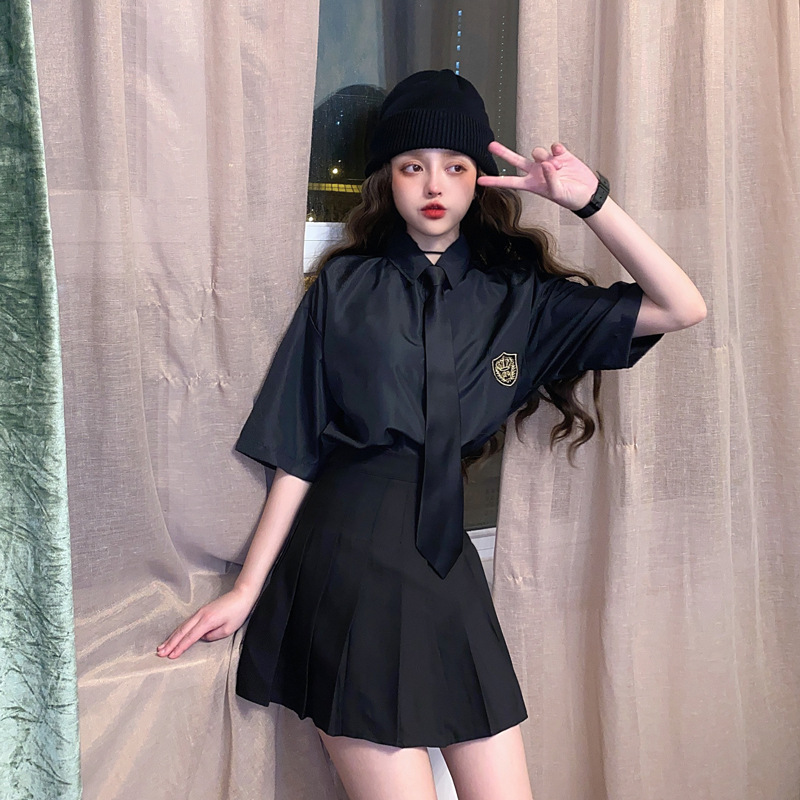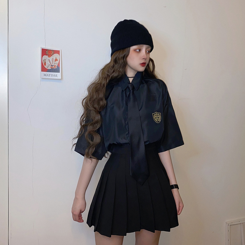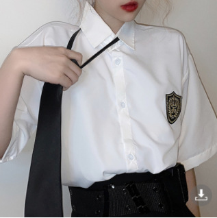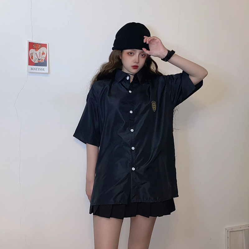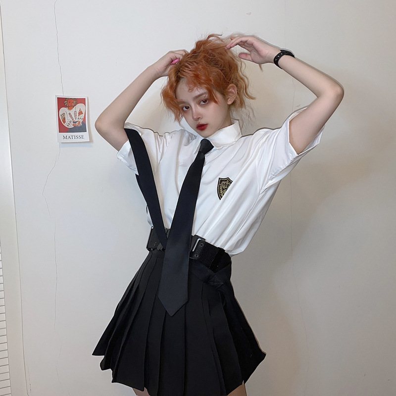 2021 여름 반팔 셔츠 여성 대학 스타일 배지 넥타이 클래스 의류 회색 흰색 셔츠 한국식 느슨한 패션스토어 가기