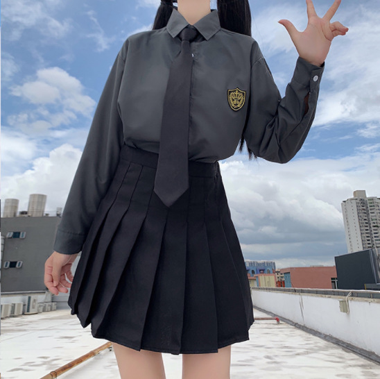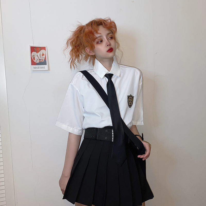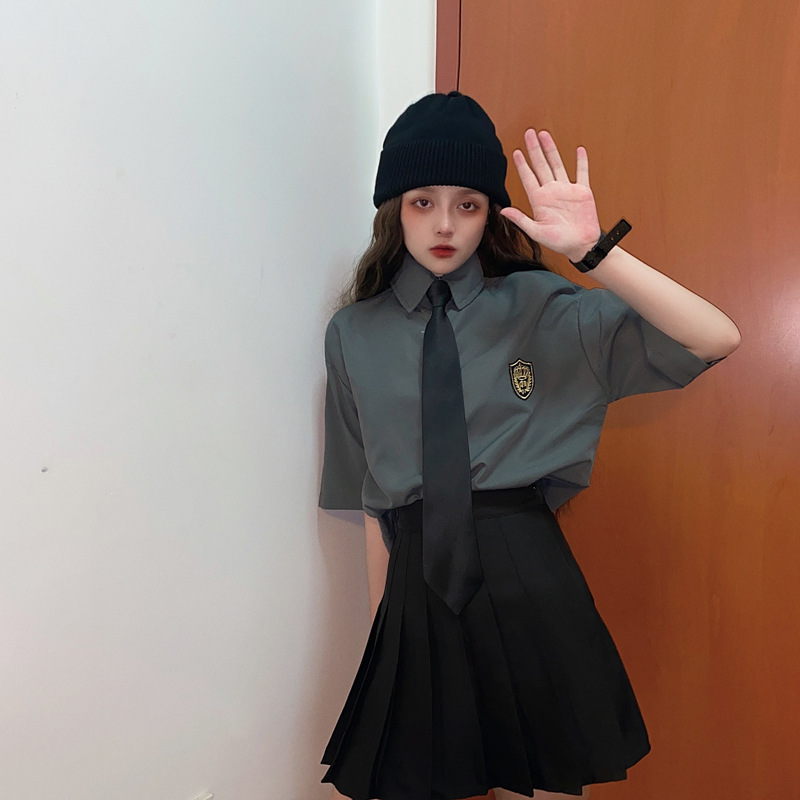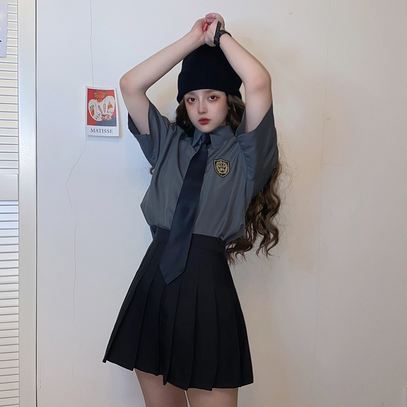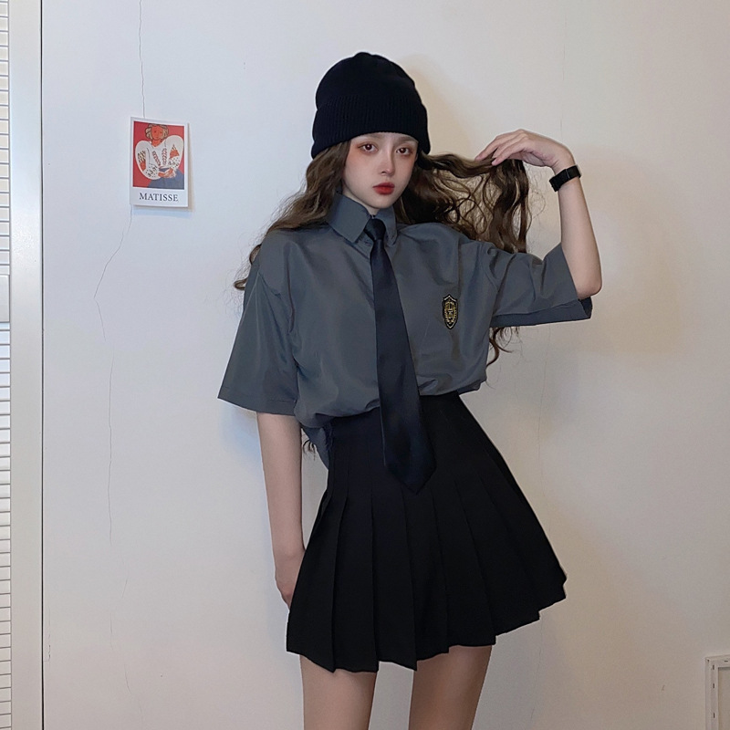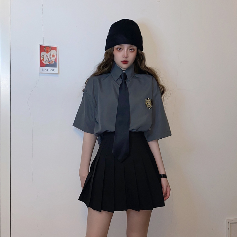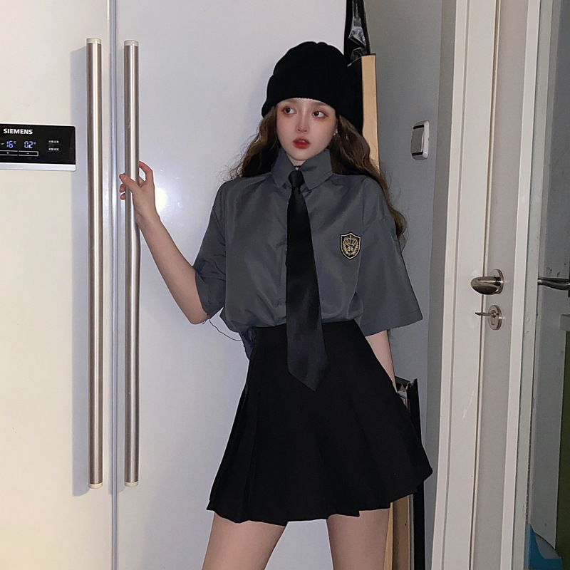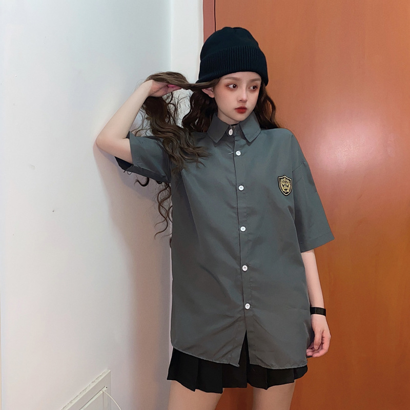 2021 여름 반팔 셔츠 여성 대학 스타일 배지 넥타이 클래스 의류 회색 흰색 셔츠 한국식 느슨한 패션