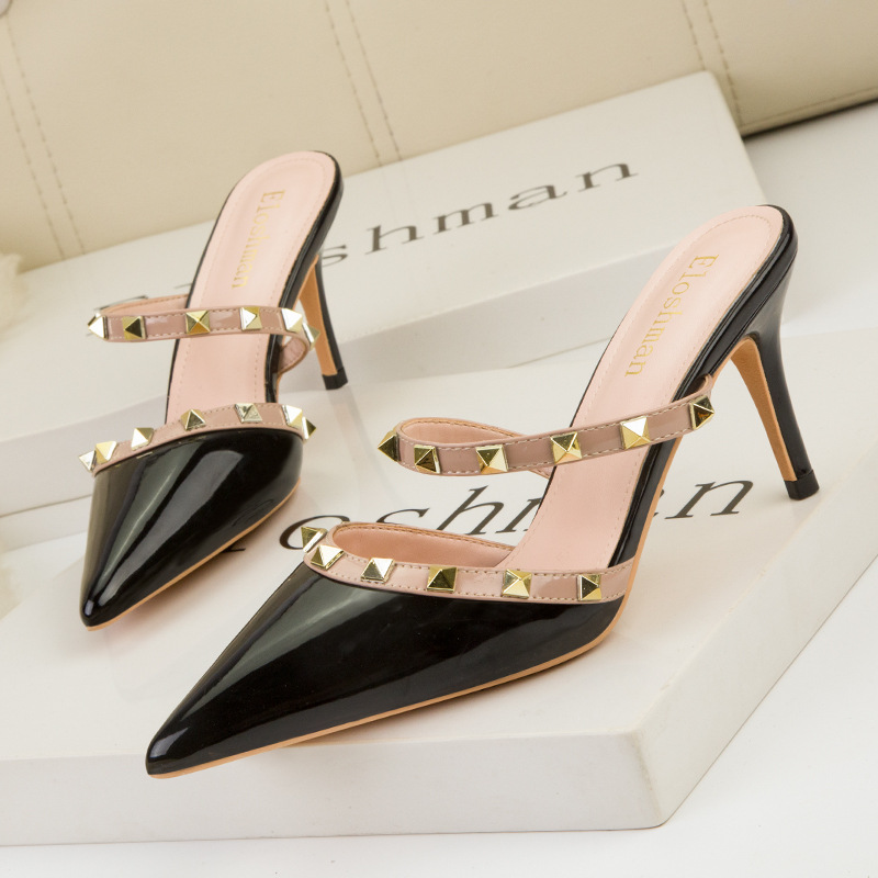 899-46 유럽과 미국 섹시 슬리밍 하이힐 얕은 뾰족한 중공 금속 리벳 에나멜 가죽 샌들과 여성 신발