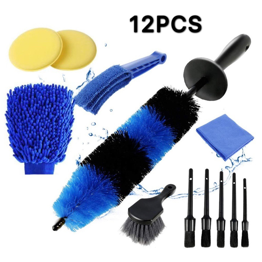 【12件汽车刷套件】此车轮刷套件包括1件17英寸长的轮辋刷、5种不同尺寸的汽车装饰刷、1件轮胎刷、1件排气刷、1件汽车清洁毛巾、1个手套和2片海绵片。