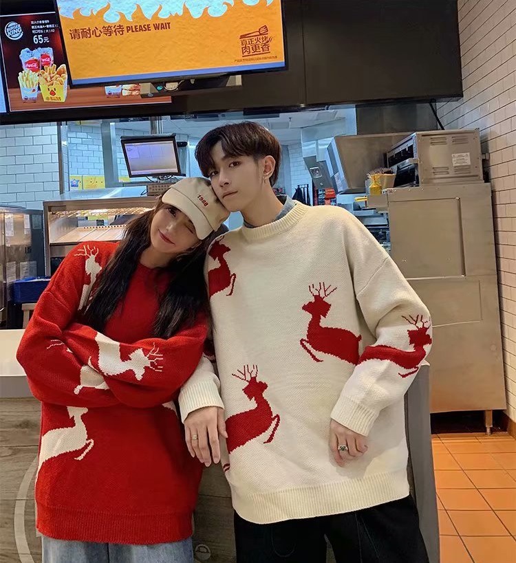 엘크 긴팔 스웨터 남성용 느슨한 라운드 넥 스웨터 홍콩 스타일 트렌디 브랜드 유행 커플 신선한 크리스마스 베이스 셔츠