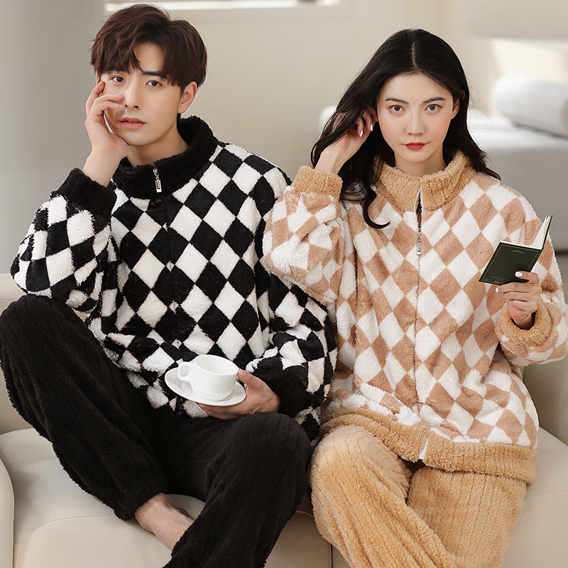 커플 잠옷 여자의 겨울 산호 양털 긴 소매 귀여운 두꺼운 플란넬 남자의 한국 스타일 아웃웨어 가디건 가정 의류스토어 가기