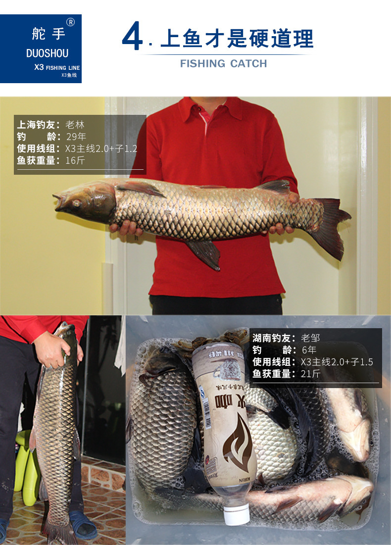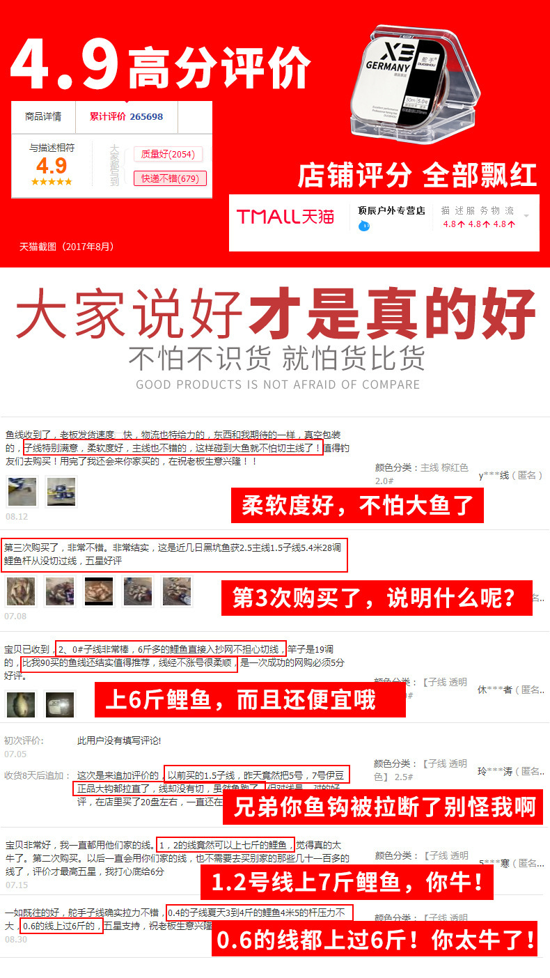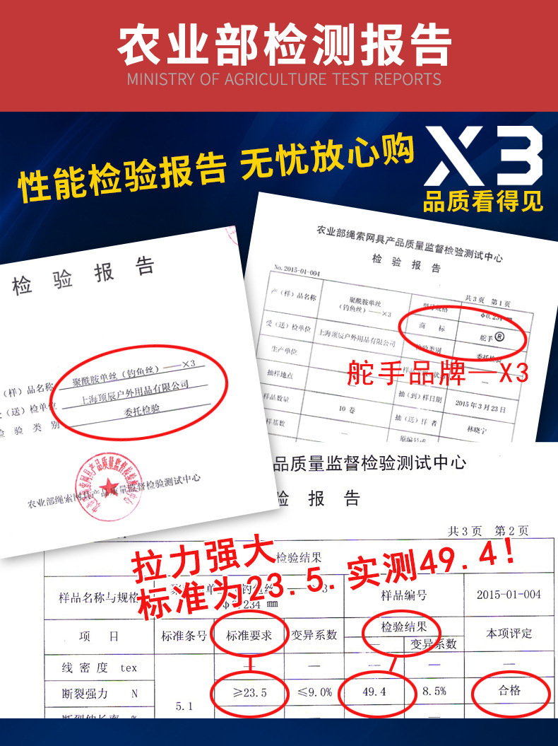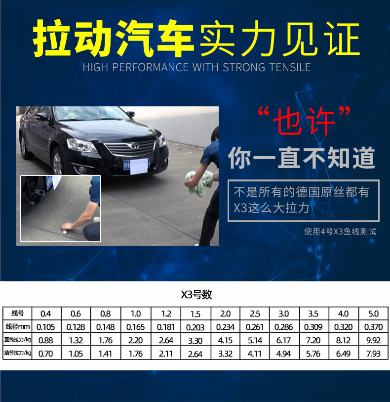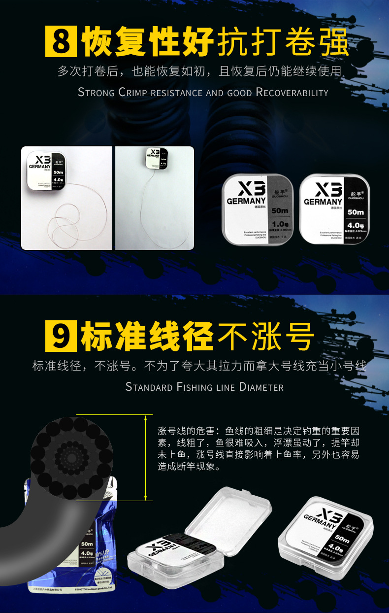 注: 一般的鱼线所标称的拉力都是直线拉力,实际使用中无论是绑钩还是线头处理都是要打结的,因打结方法不同拉力下降的程度也不同,标直线拉力并没有意义。如果您一定想了解拉力值,可参考其它钓线。