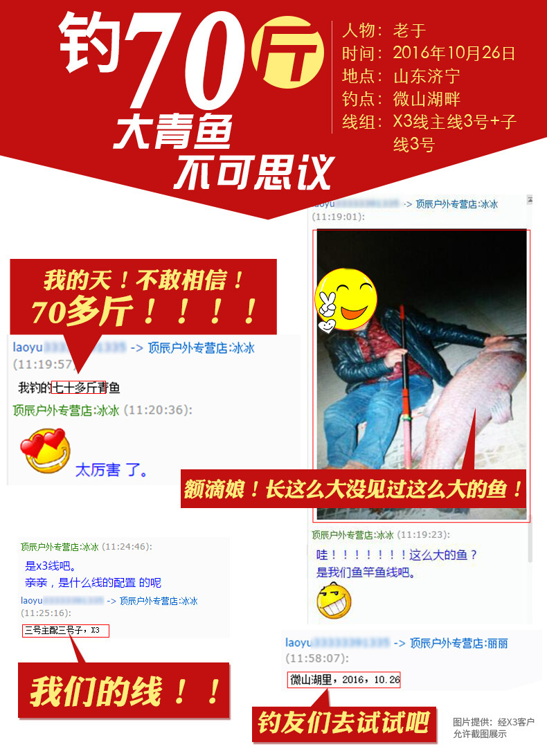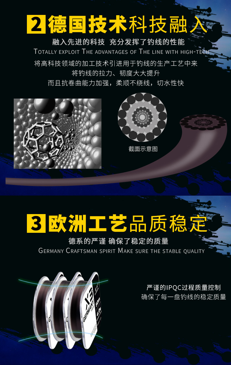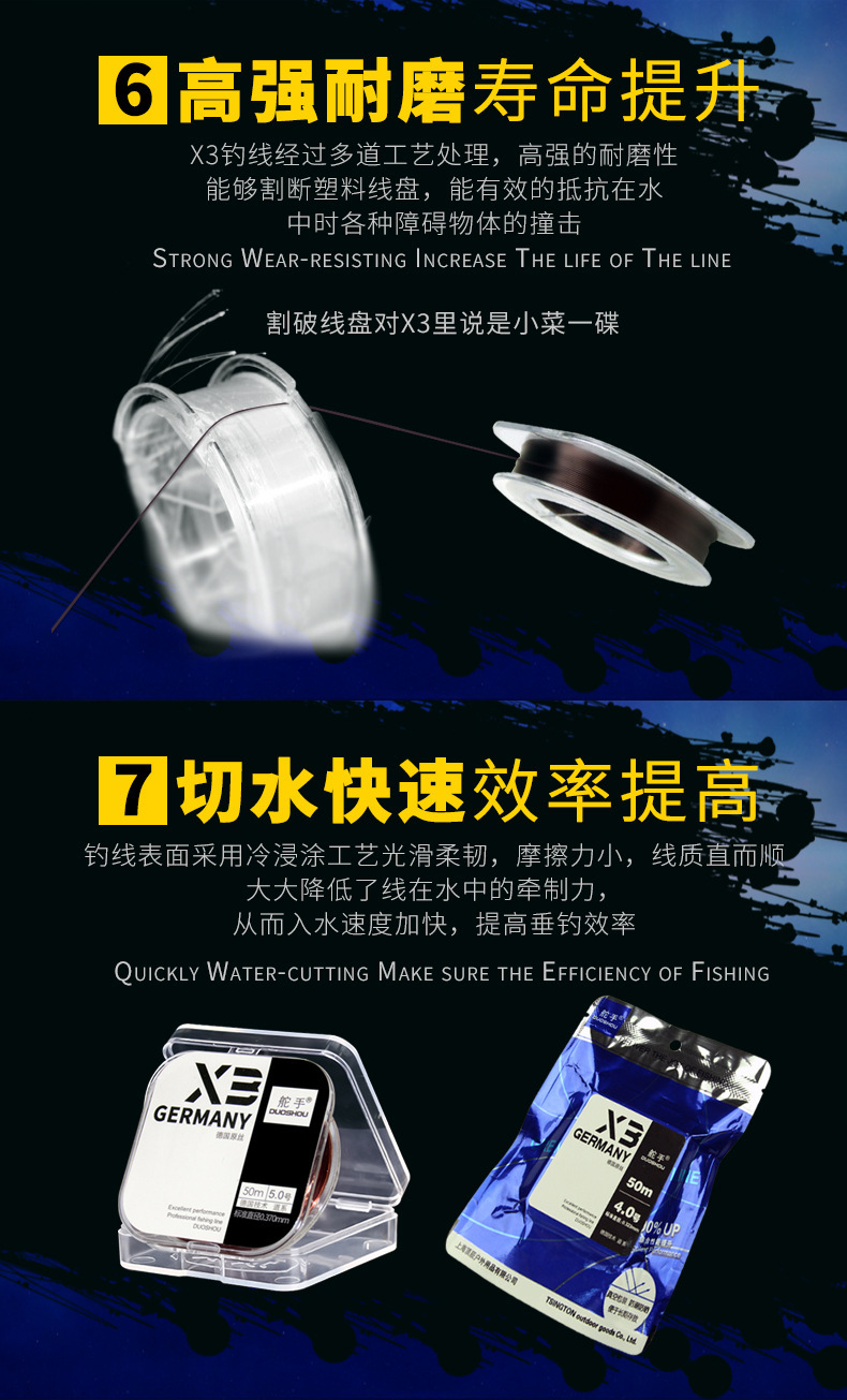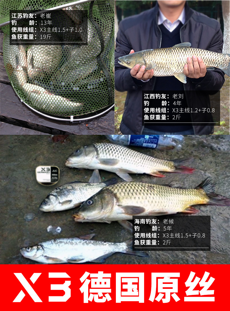 注: 一般的鱼线所标称的拉力都是直线拉力,实际使用中无论是绑钩还是线头处理都是要打结的,因打结方法不同拉力下降的程度也不同,标直线拉力并没有意义。如果您一定想了解拉力值,可参考其它钓线。