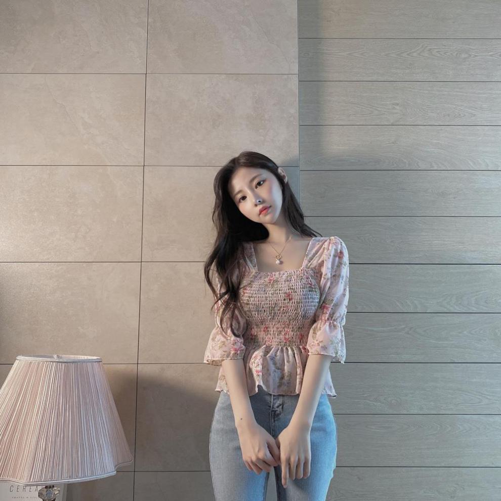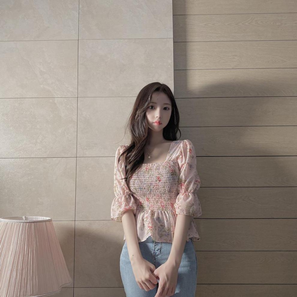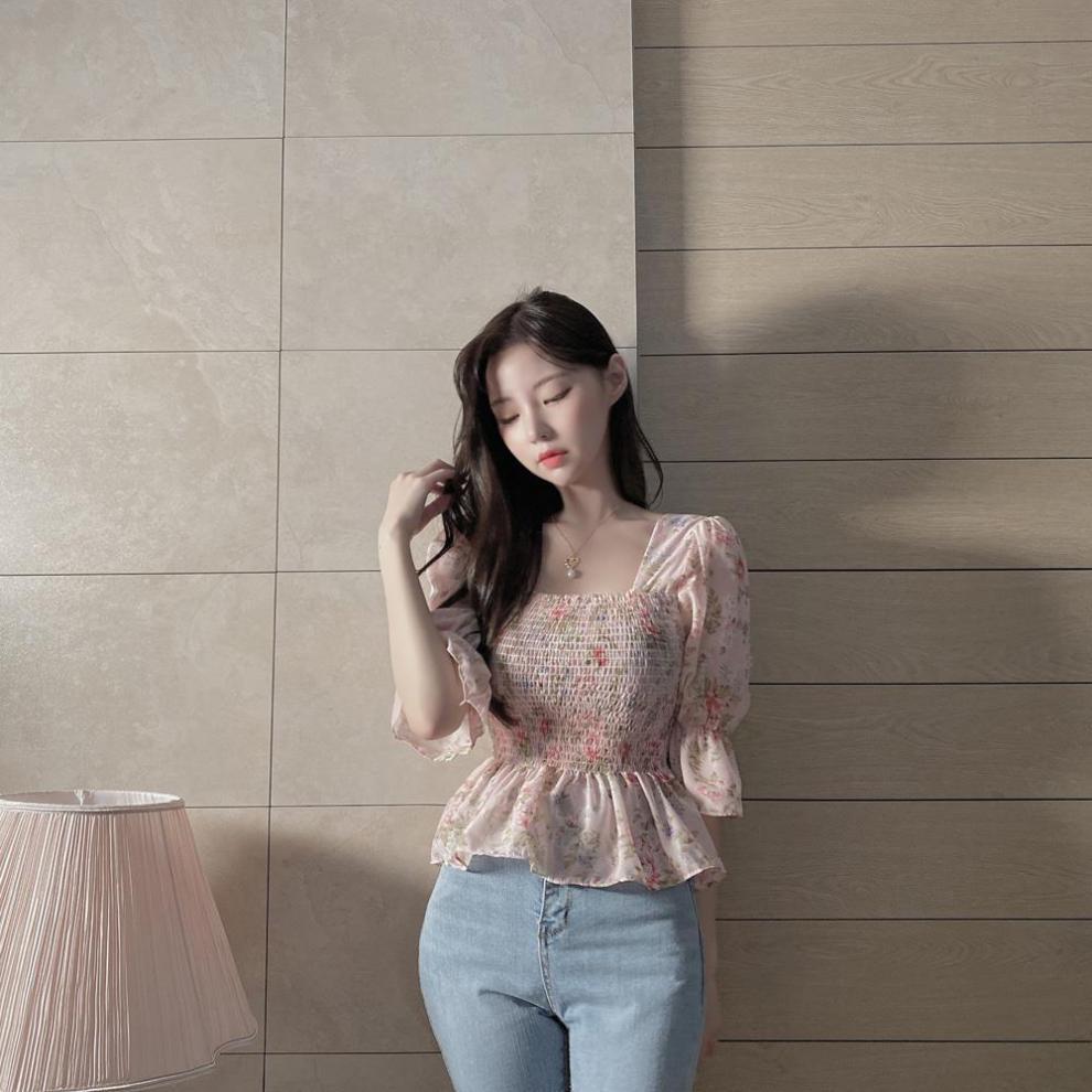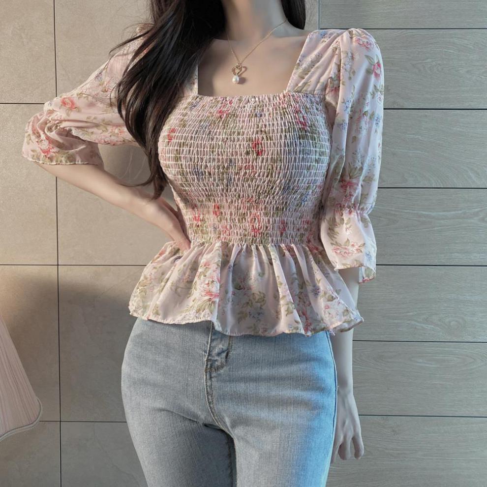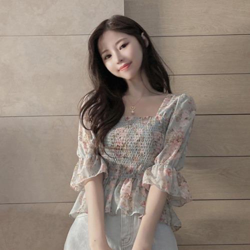 2023 여름 타이트 웨이스트 슬리밍 반팔 셔츠 디자인 센스 여성용 프릴 플로럴 쉬폰 쇼트 탑스토어 가기