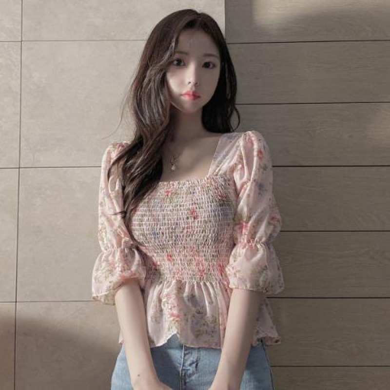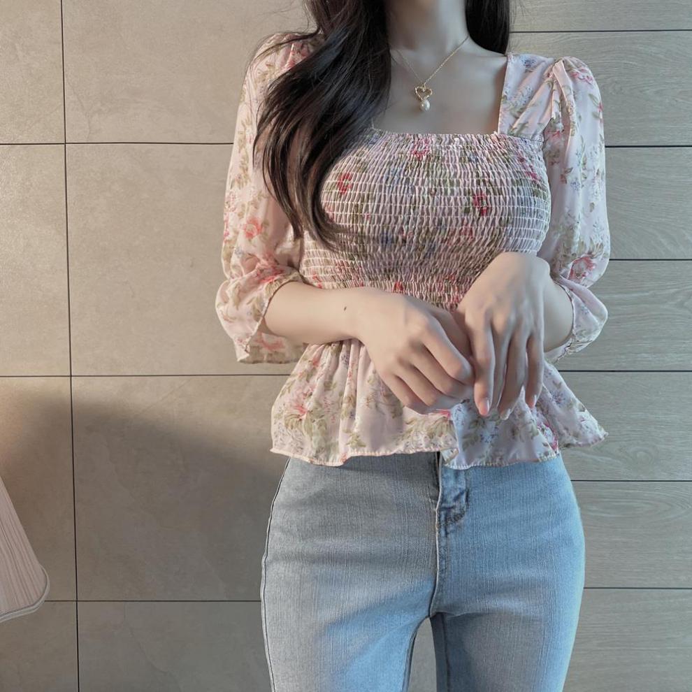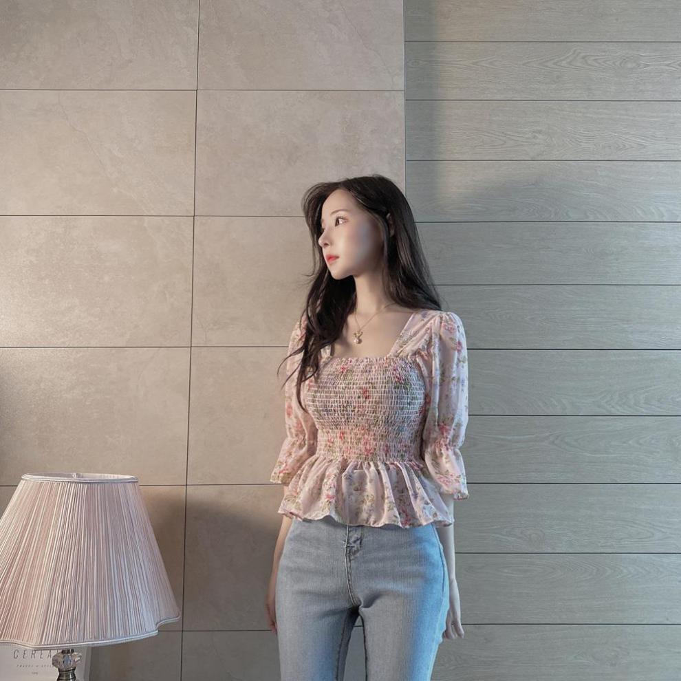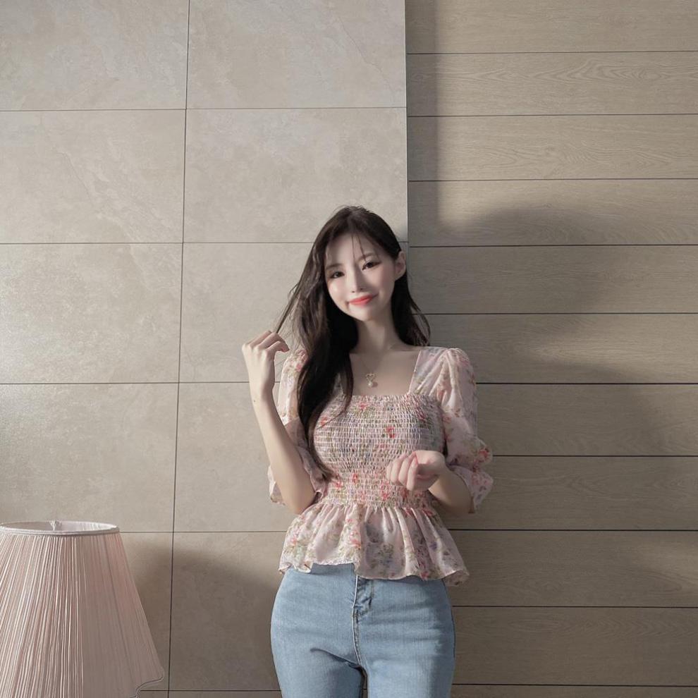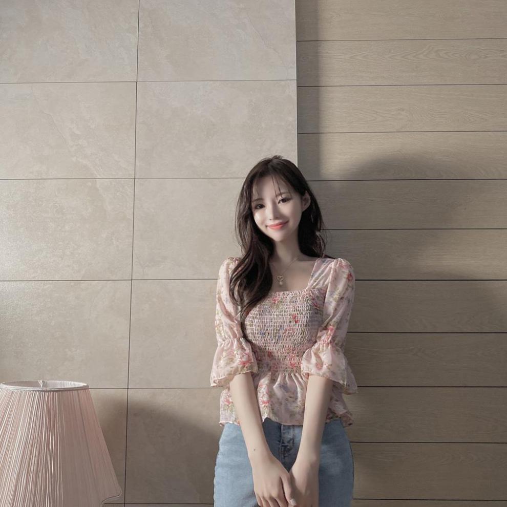 2023 여름 타이트 웨이스트 슬리밍 반팔 셔츠 디자인 센스 여성용 프릴 플로럴 쉬폰 쇼트 탑스토어 가기