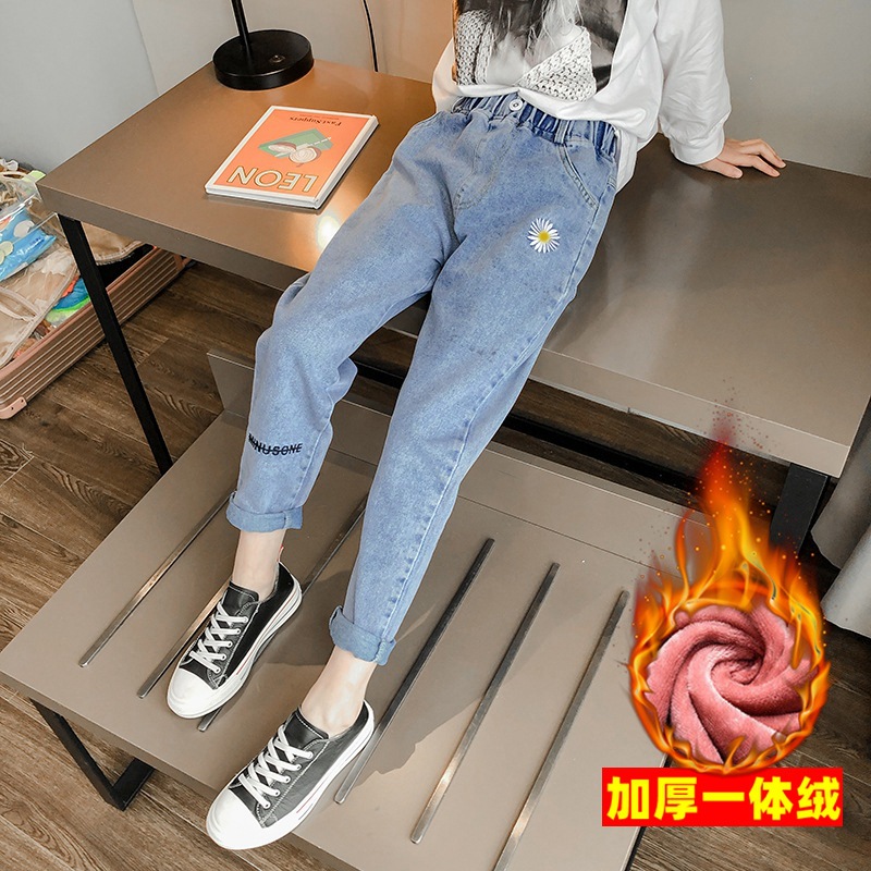 여아 기모 두꺼운 청바지 2022 겨울 새로운 소녀의 스트레치 중간 및 큰 어린이 원피스 벨벳 따뜻한 면 바지