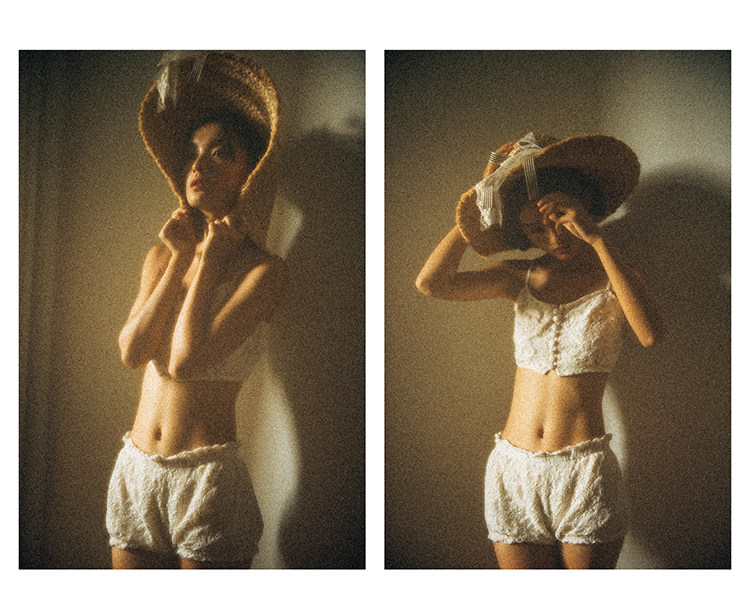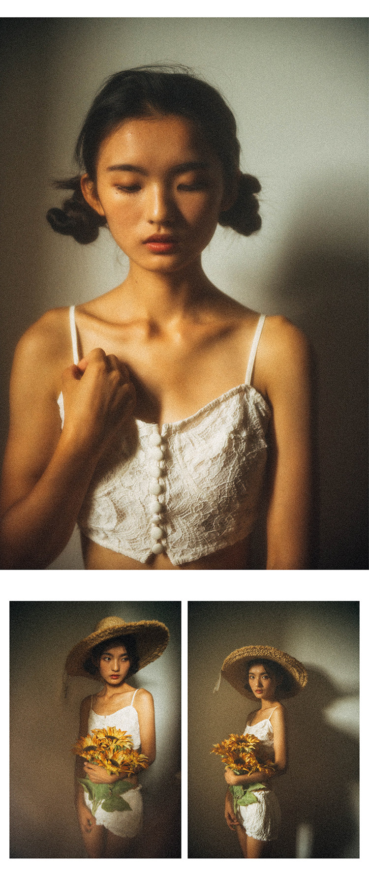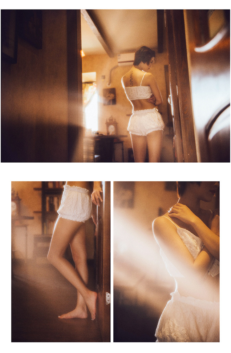 肩部细细的小吊带不经意间的滑落,被细软顺滑的发丝缠绕,上衣的长度恰巧露出纤细的腰线,更巧妙的隐藏了小缺点。