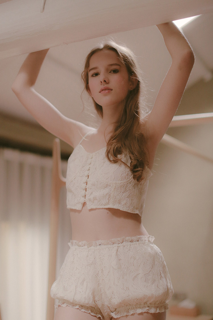 短裤整体成灯笼状,恰到好处的蓬松感和漂亮的小弧线,裤脚的小收口也同样配有和腰部呼应的可人小蕾丝。