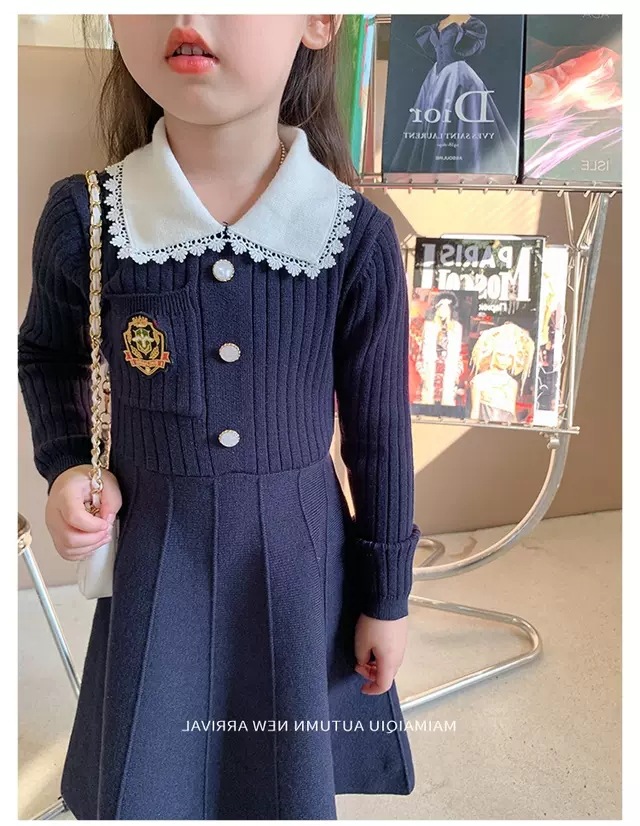 여아 2025 봄 가을 신상 아기 대학풍 모직 스커트 어린이 긴팔 카라 스웨터 원피스