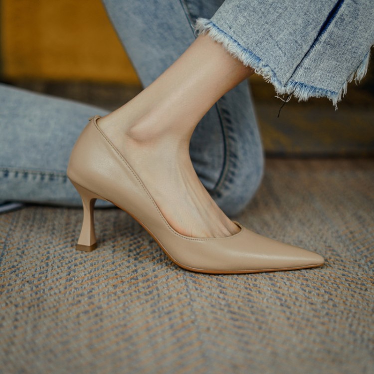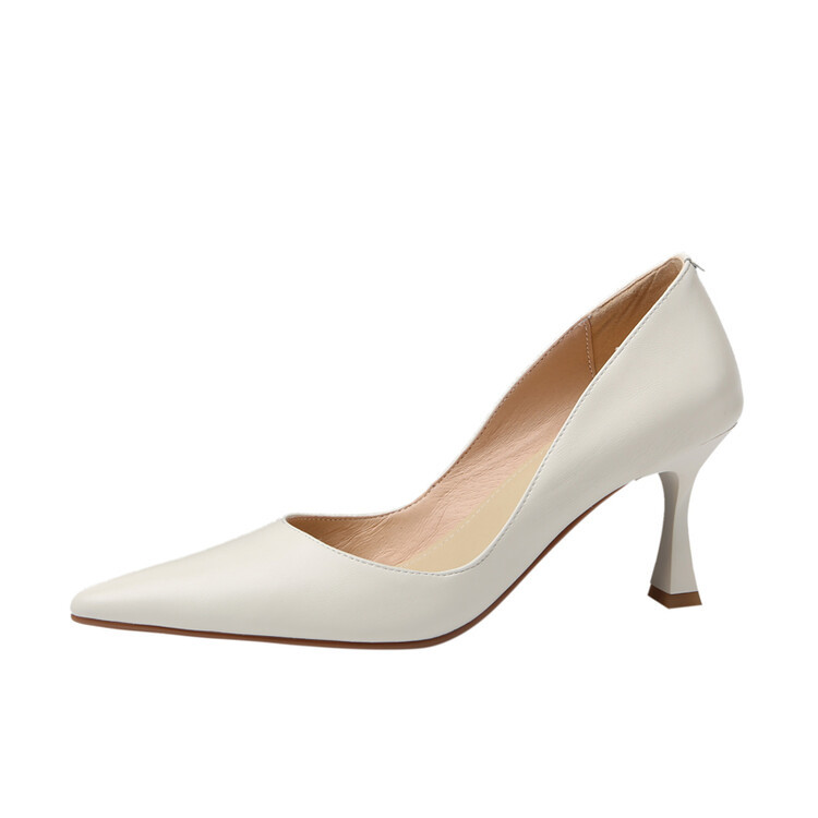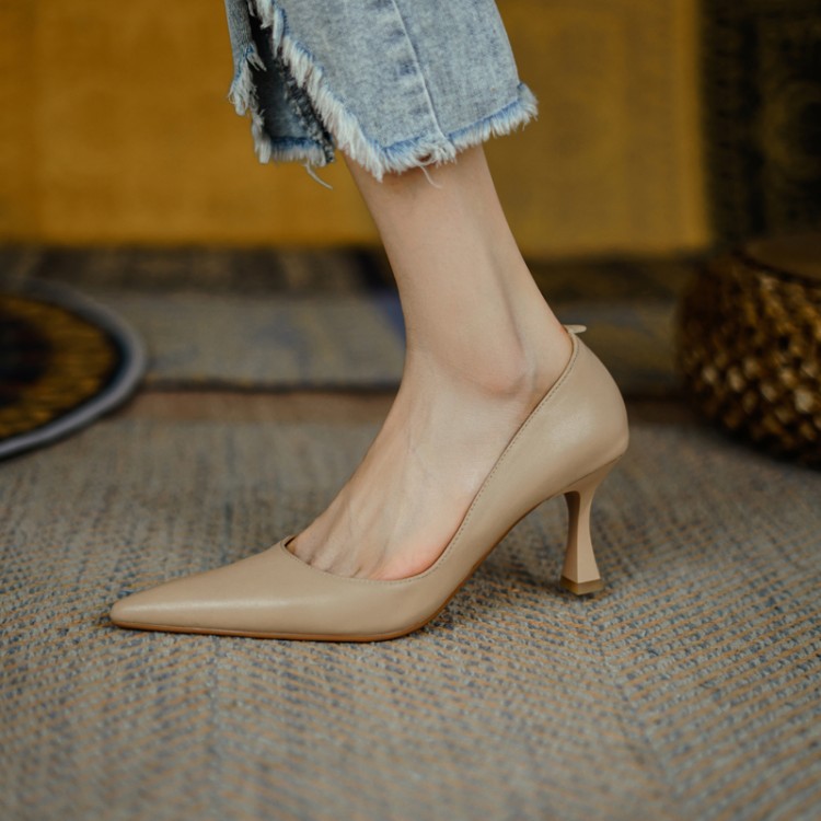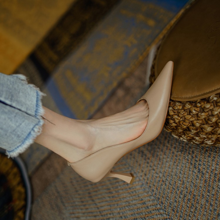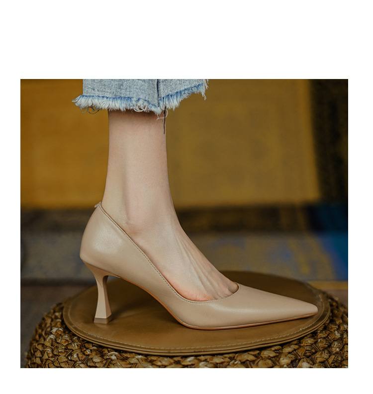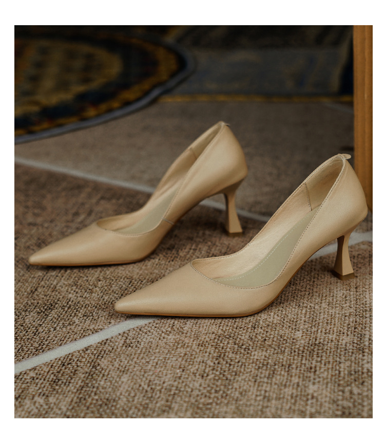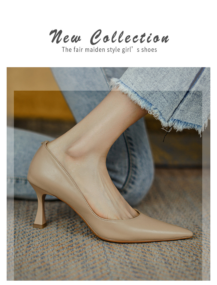 여성용 전체 가죽 신발 스틸레토 힐 뾰족한 발가락 얕은 입 신발 양가죽 한국식 뾰족한 발가락 우아한 하이힐 통근 작업 신발스토어 가기