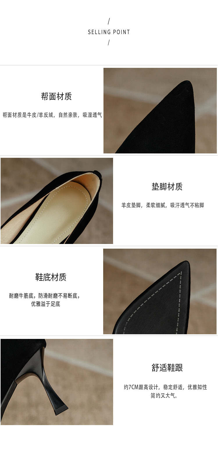 【鞋面材质】 :黑色皮面 杏色和白色为二层羊皮    黑色翻皮为羊反绒
