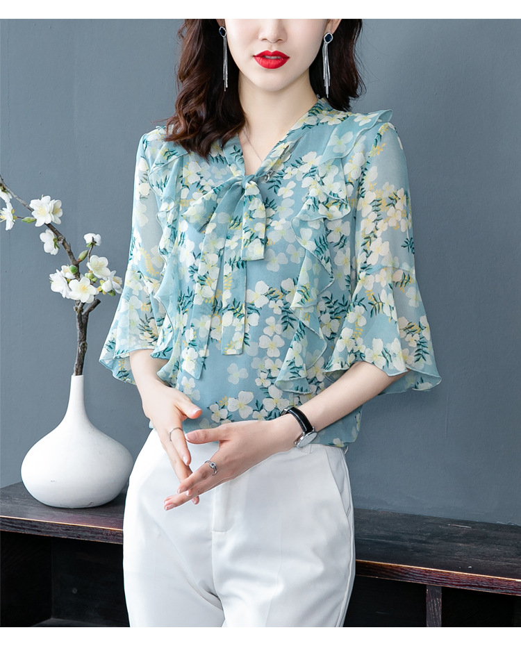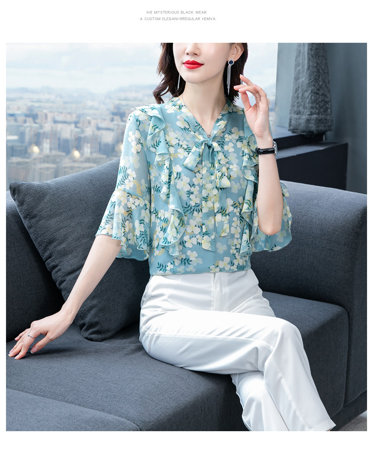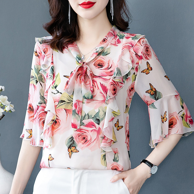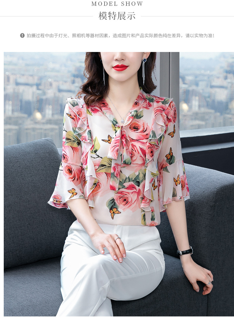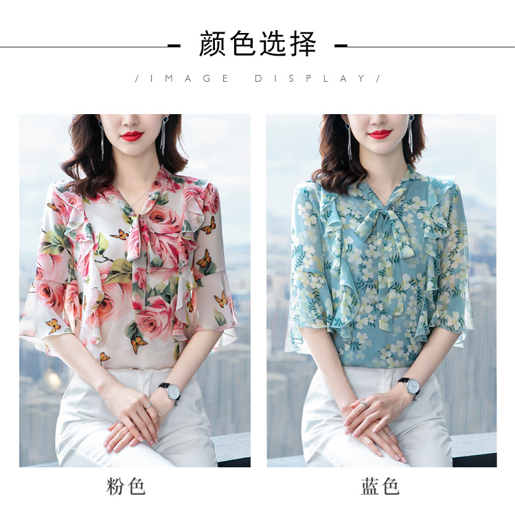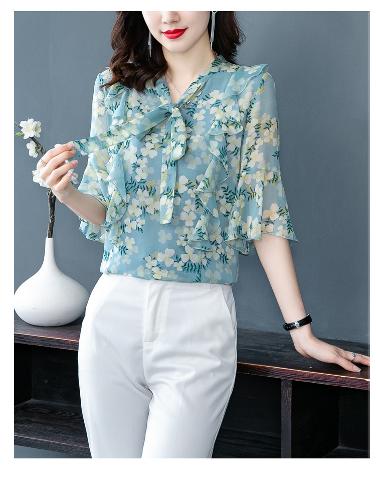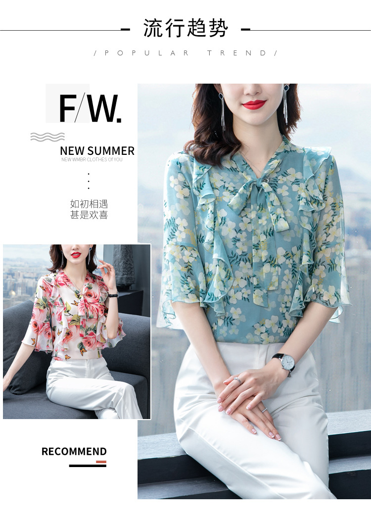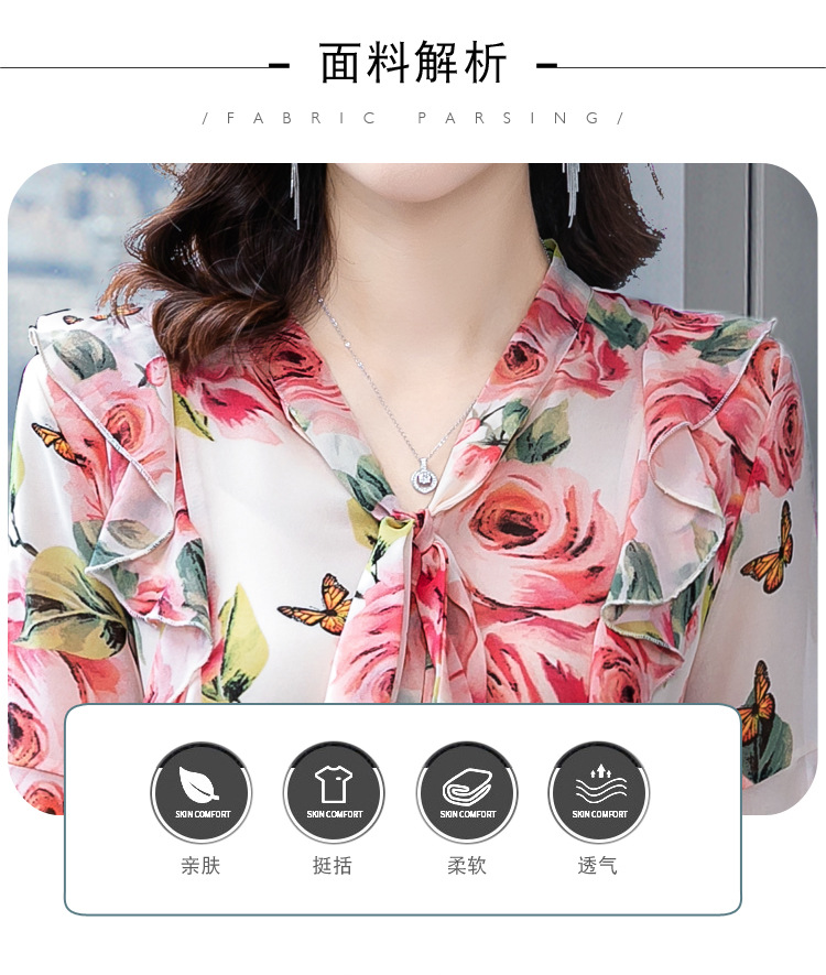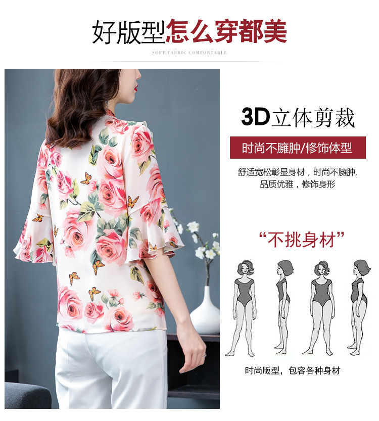 중년 루즈한 쉬폰 셔츠 여성용 반팔 2021 년 새로운 패션 플로럴 탑 슬림 배꼽 커버 연령 감소 셔츠스토어 가기