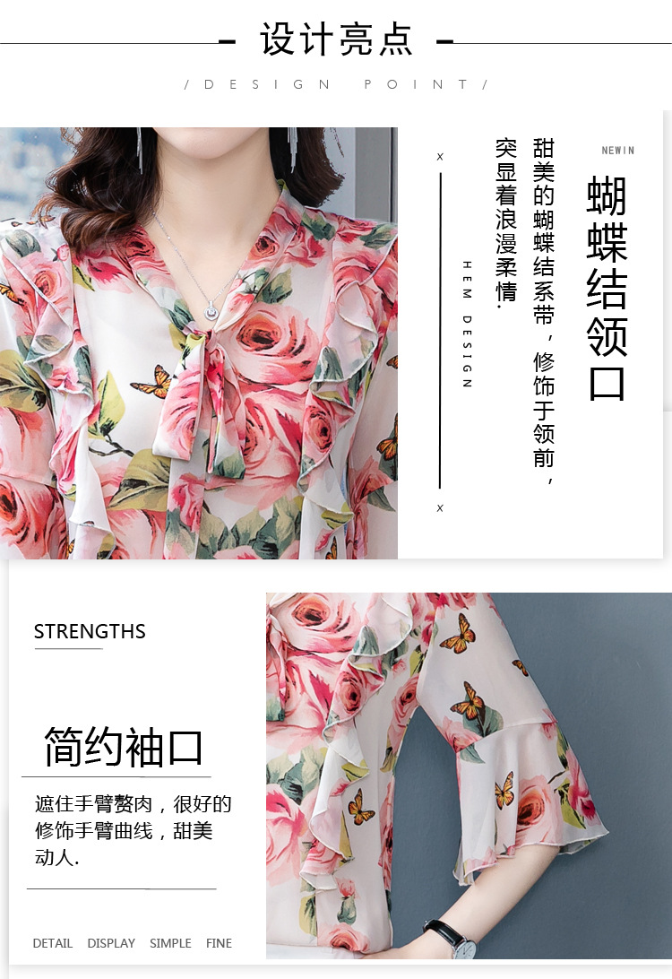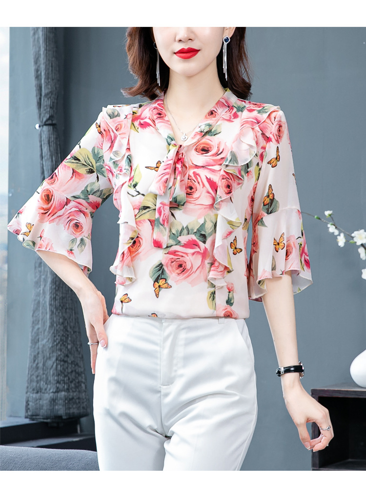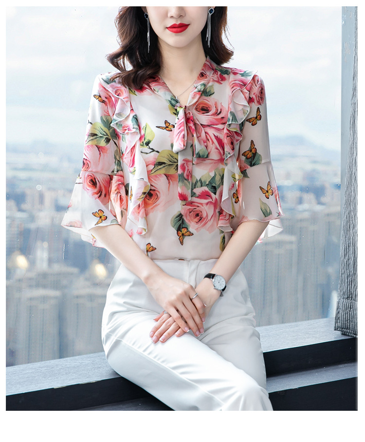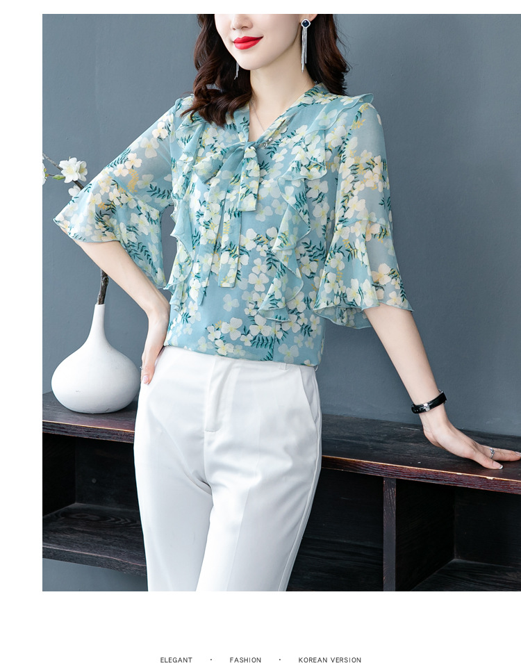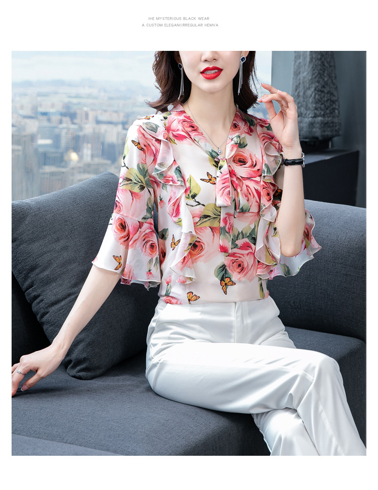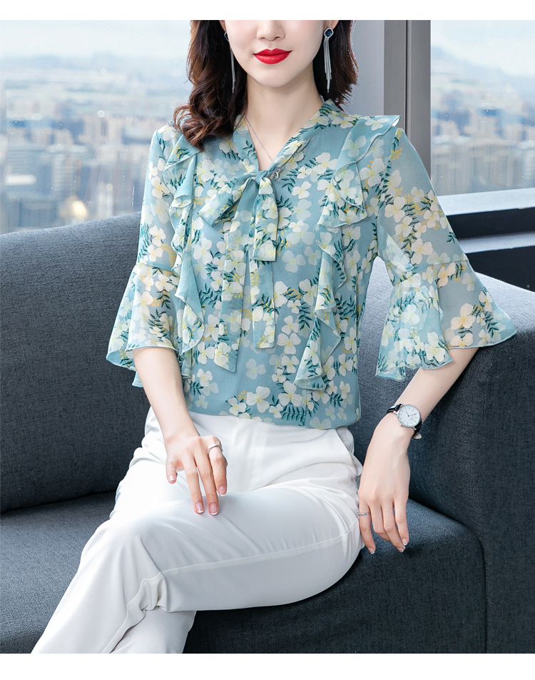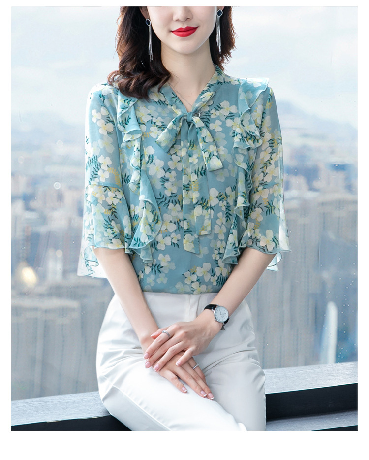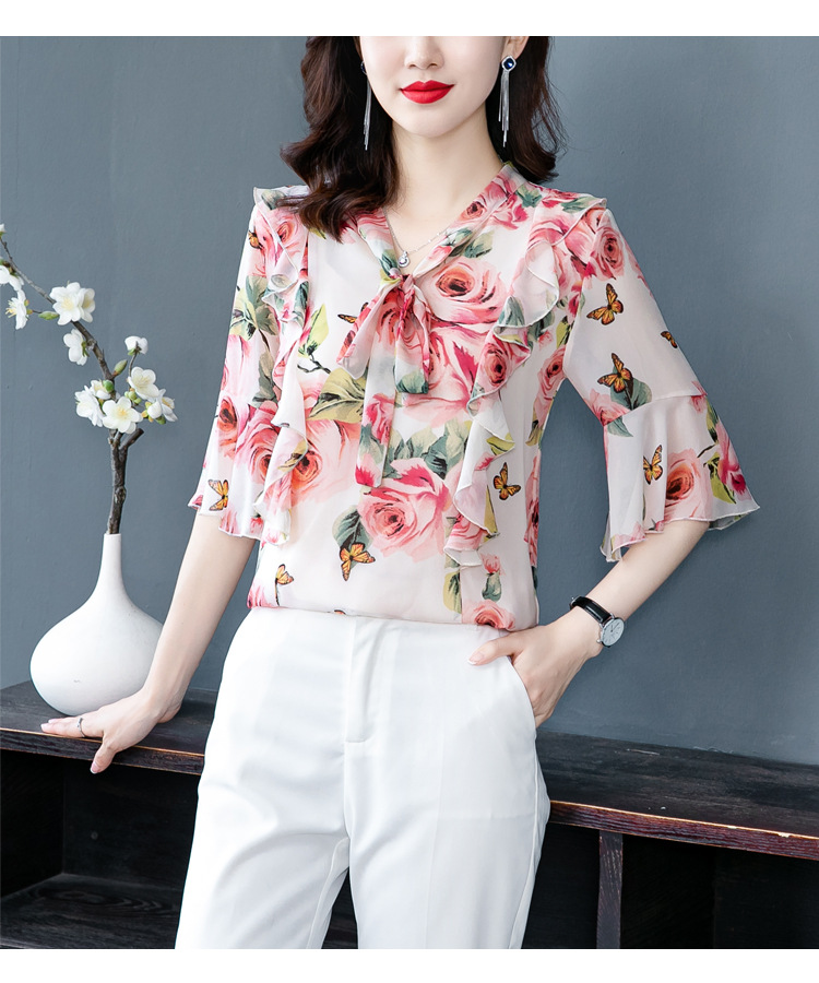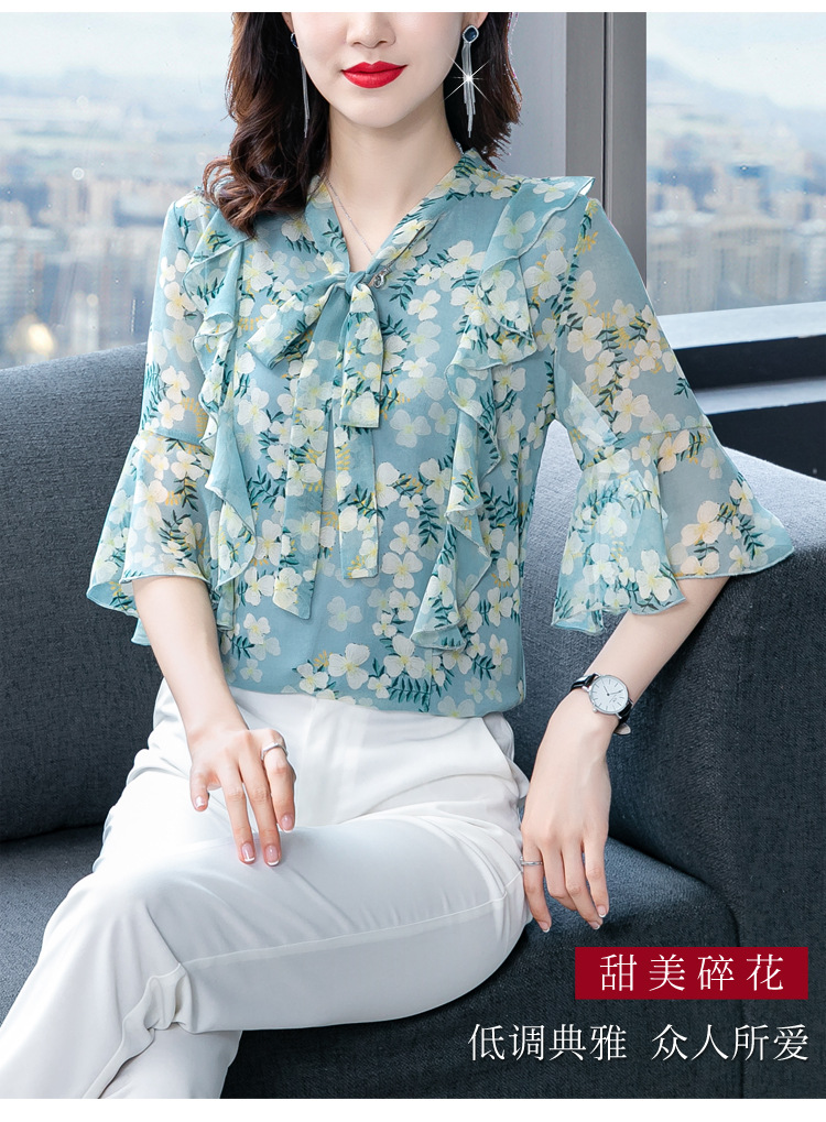 중년 루즈한 쉬폰 셔츠 여성용 반팔 2021 년 새로운 패션 플로럴 탑 슬림 배꼽 커버 연령 감소 셔츠스토어 가기