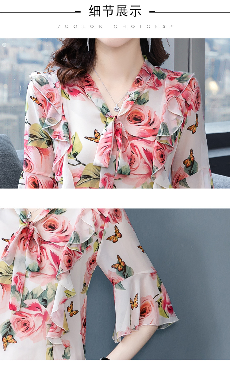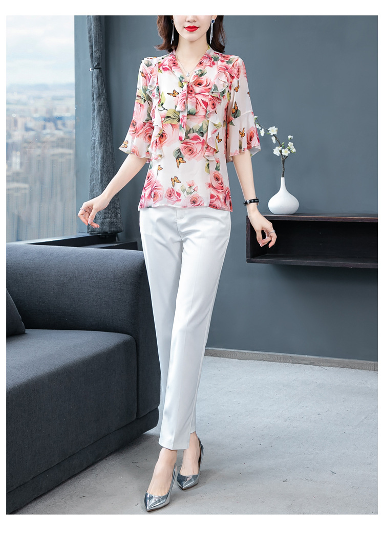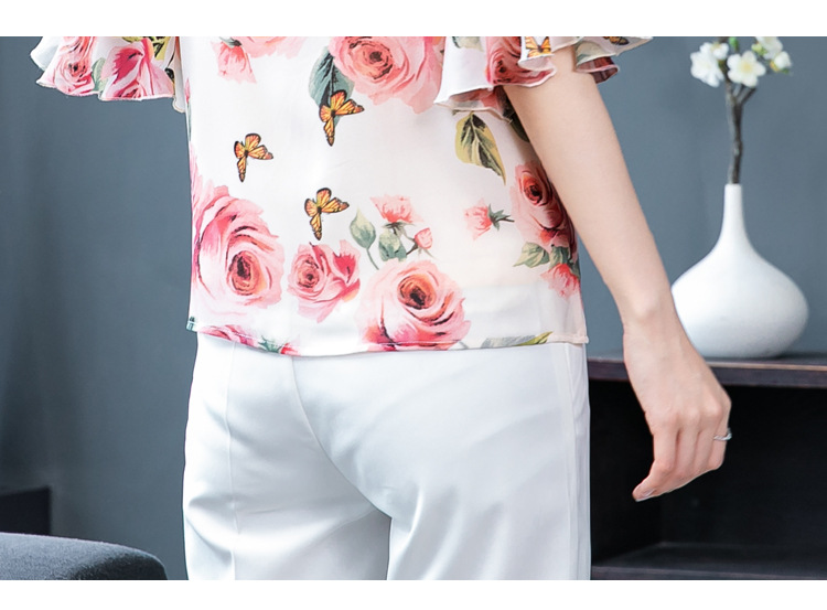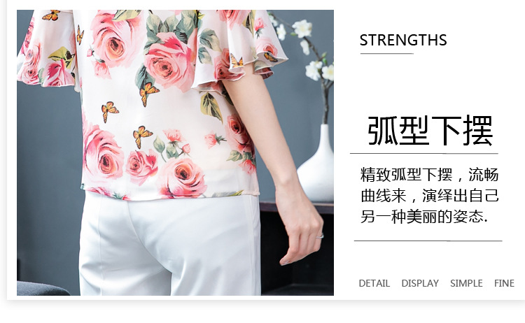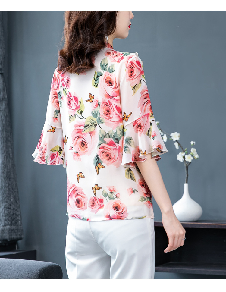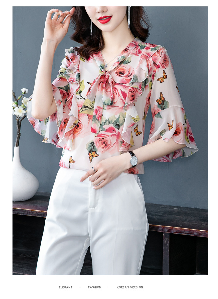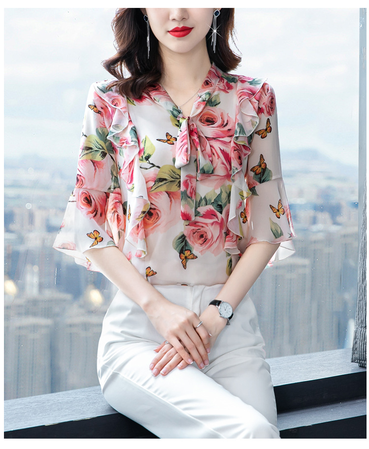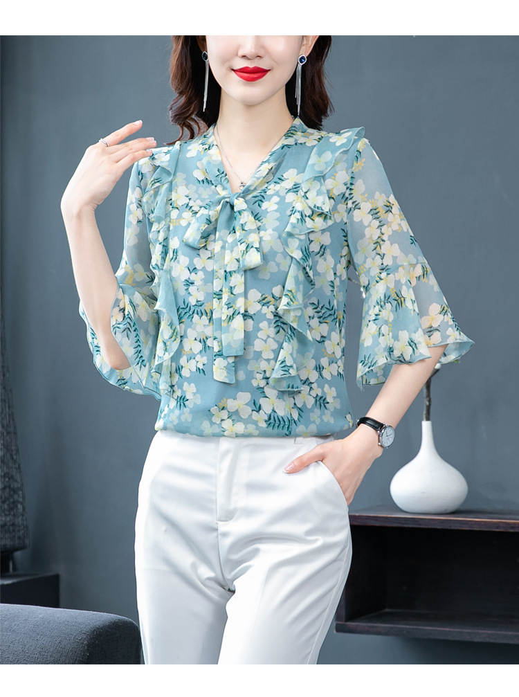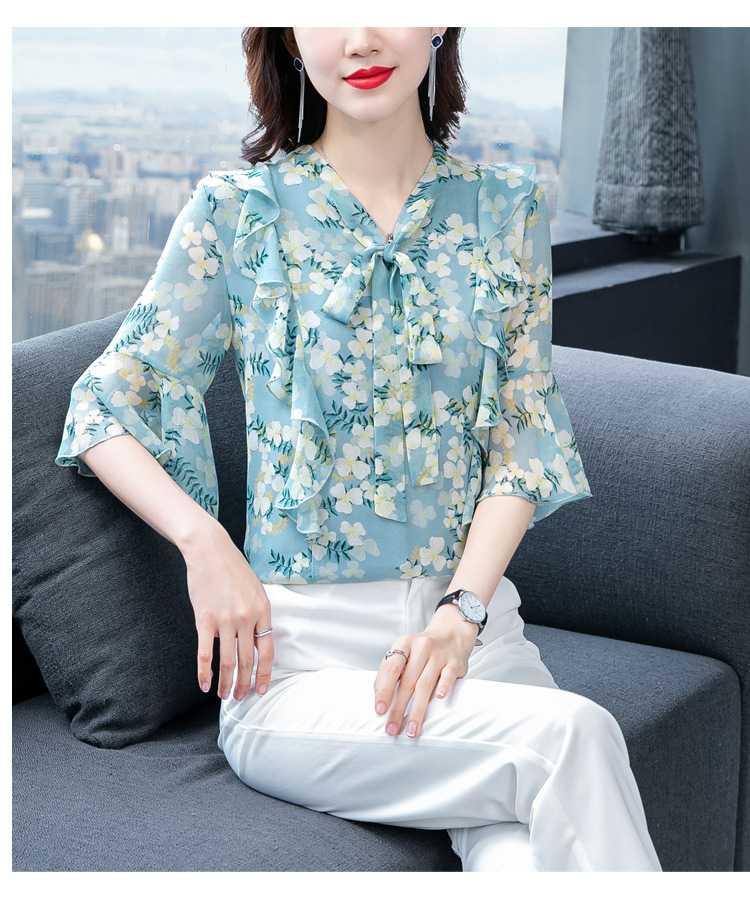 중년 루즈한 쉬폰 셔츠 여성용 반팔 2021 년 새로운 패션 플로럴 탑 슬림 배꼽 커버 연령 감소 셔츠스토어 가기