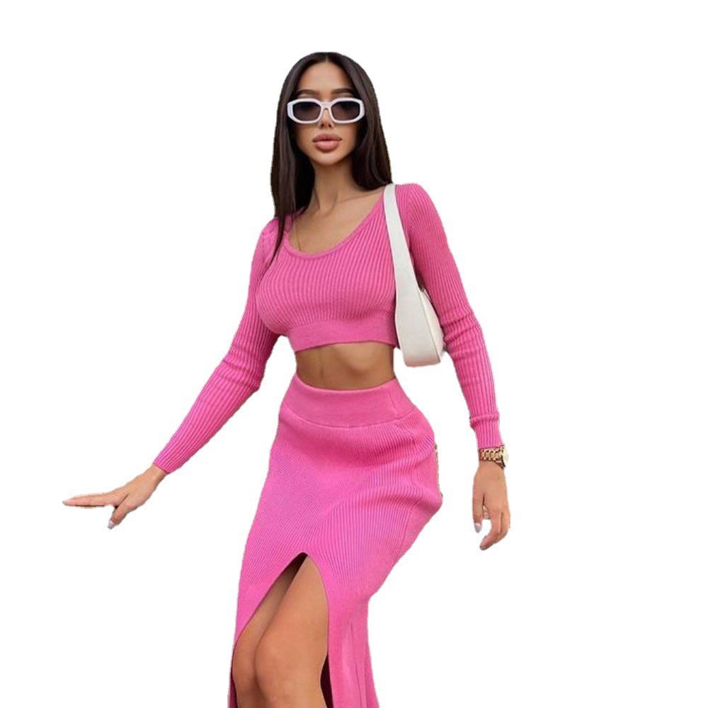 2025 봄 여름 여성 긴팔 라운드 넥 짧은 니트 스웨터 탑 슬릿 스커트 AliExpress 패션 세트스토어 가기