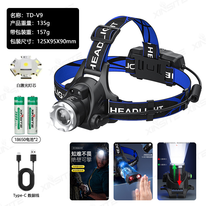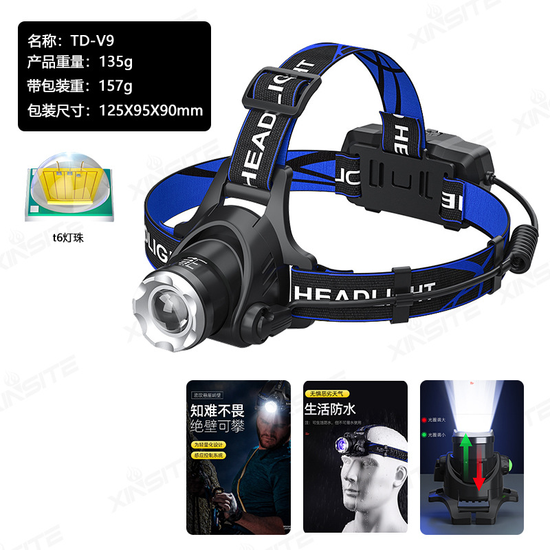 국경 간 야외 줌 유도 강한 빛 헤드 라이트 긴 배터리 수명 리튬 배터리 헤드 장착형 폭발적인 이중 광원 낚시 램프 광부의 램프스토어 가기
