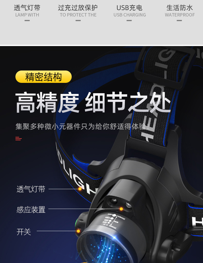 국경 간 야외 줌 유도 강한 빛 헤드 라이트 긴 배터리 수명 리튬 배터리 헤드 장착형 폭발적인 이중 광원 낚시 램프 광부의 램프