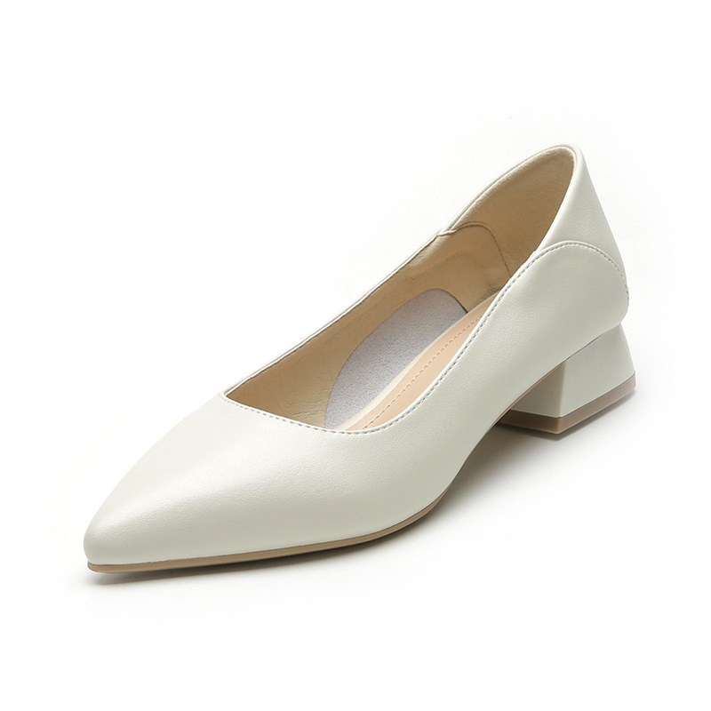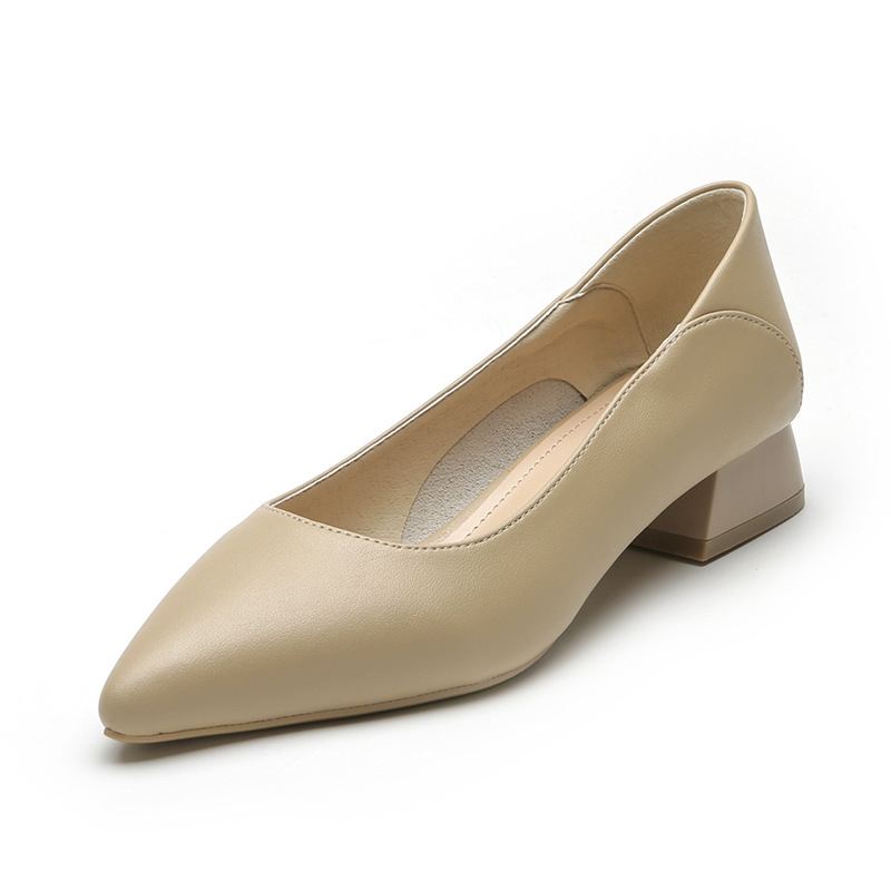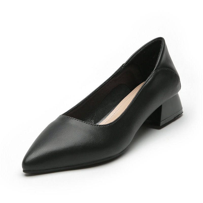 가죽 뾰족한 두꺼운 굽 신발 여성용 프랑스 심플 여성 신발 낮은 굽 얕은 입 틈새 신발 3cm 전문 작업 신발스토어 가기