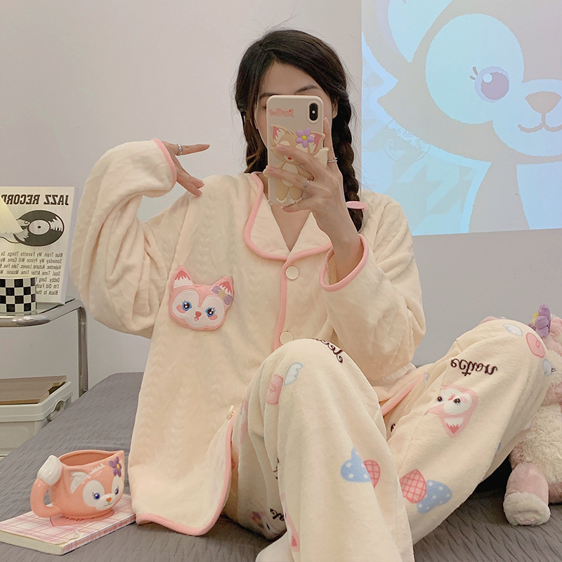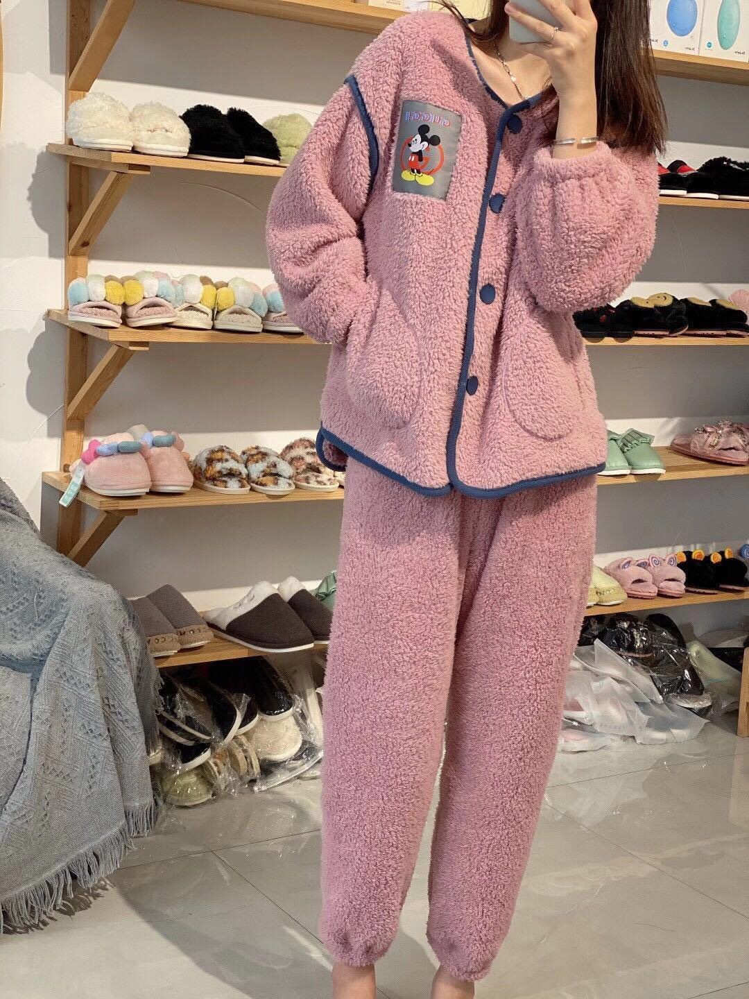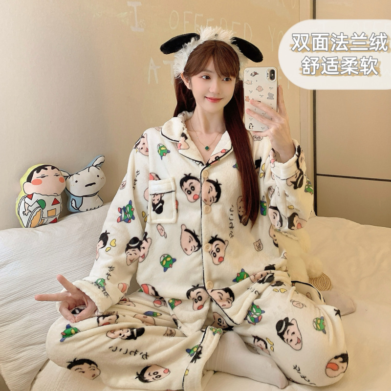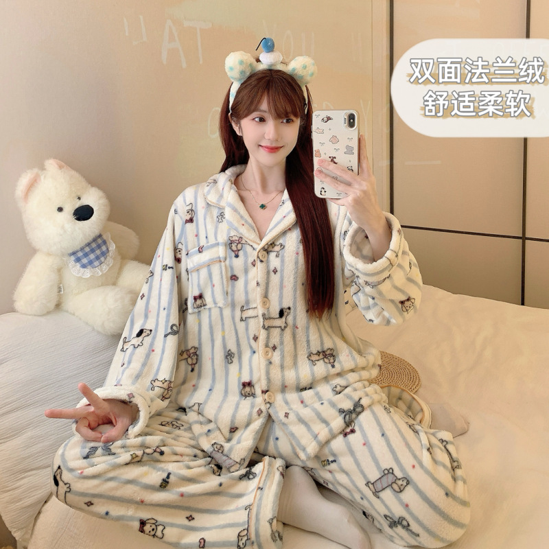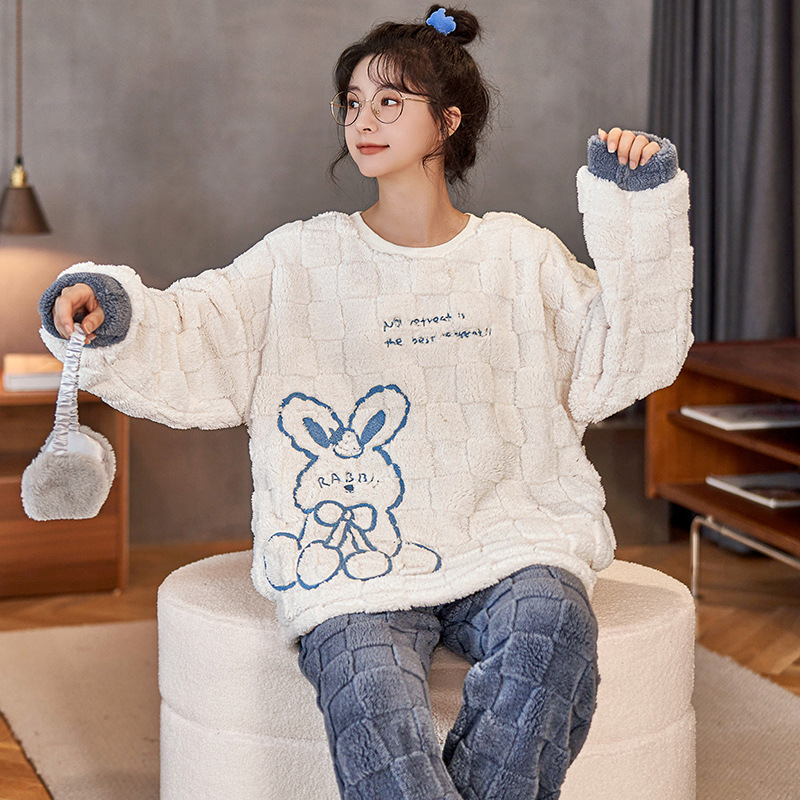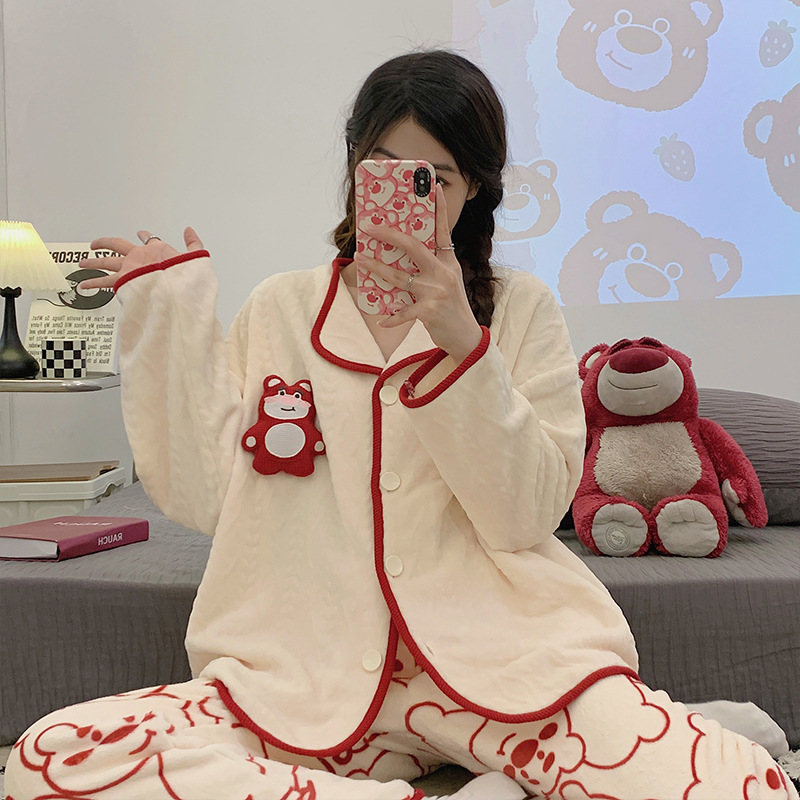 가을과 겨울 만화 산호 양털 두꺼운 가을과 겨울 여성의 따뜻한 잠옷 느슨한 캐주얼웨어 귀여운 가정 옷 세트스토어 가기