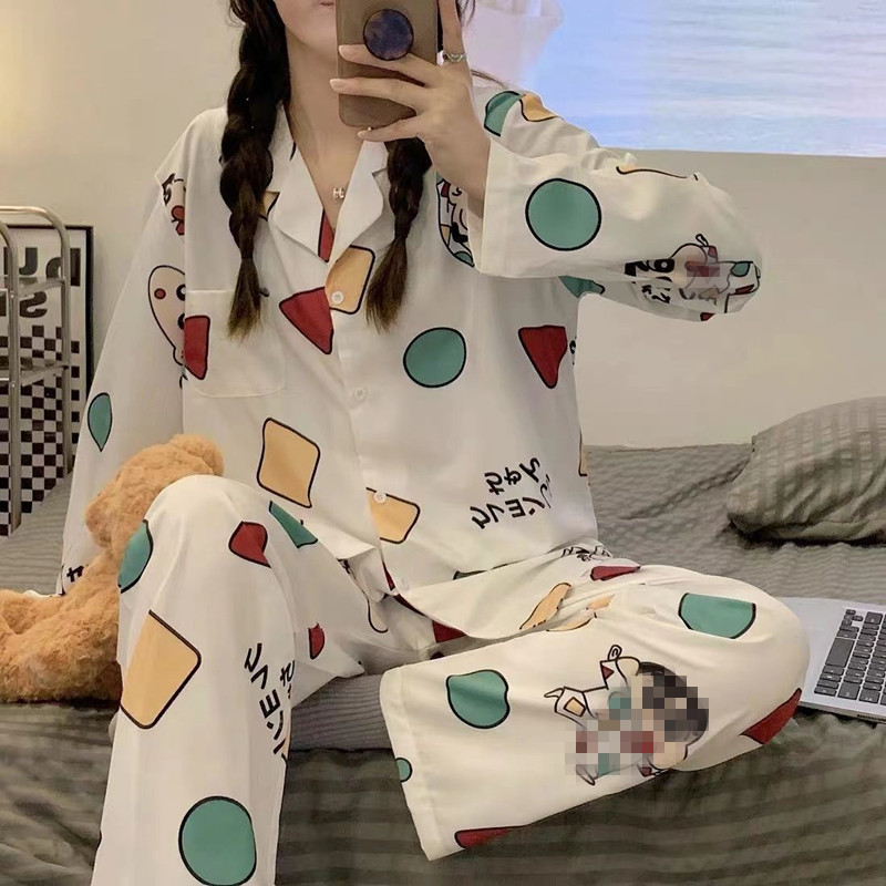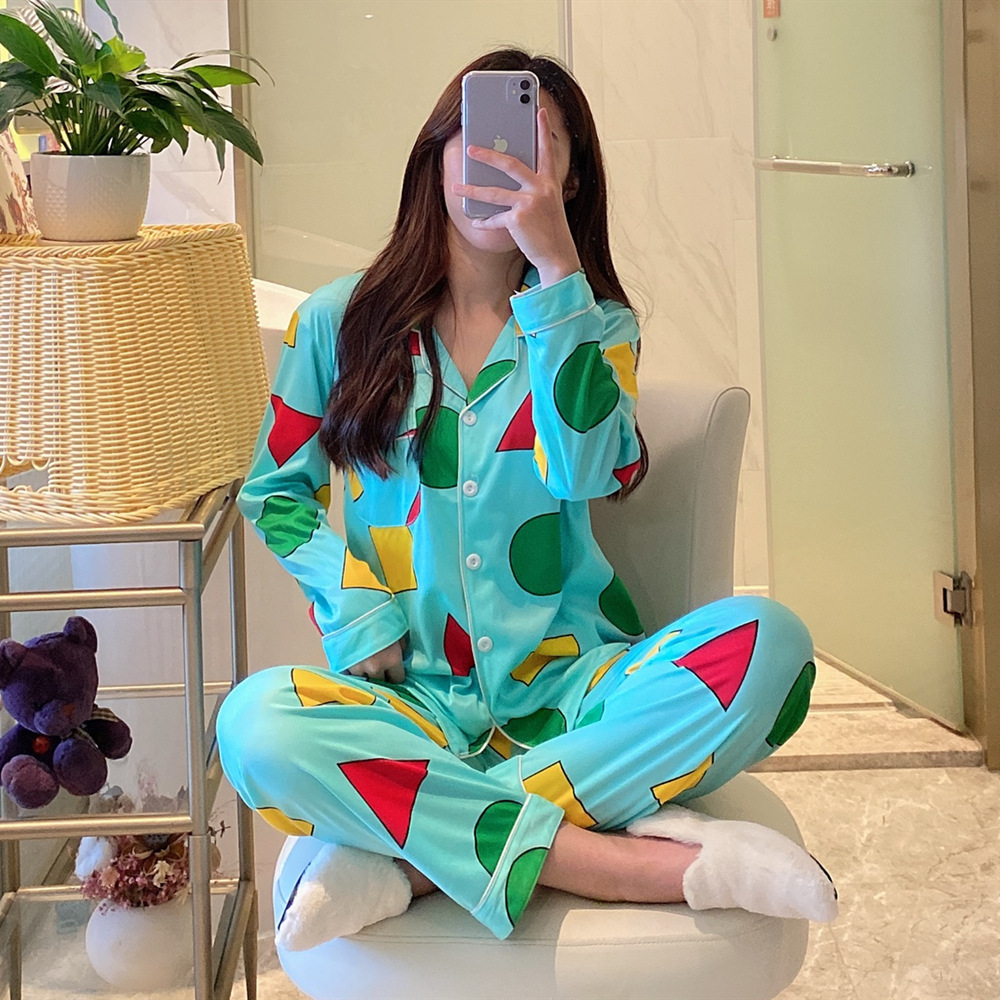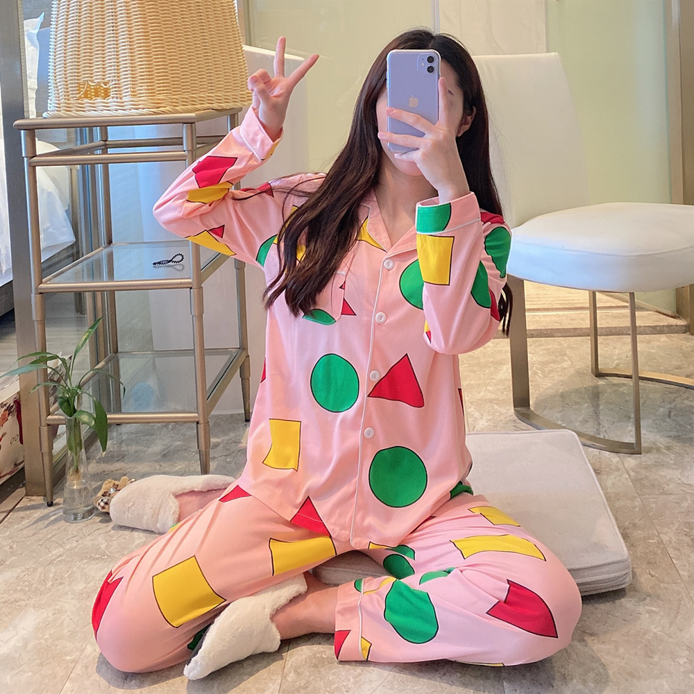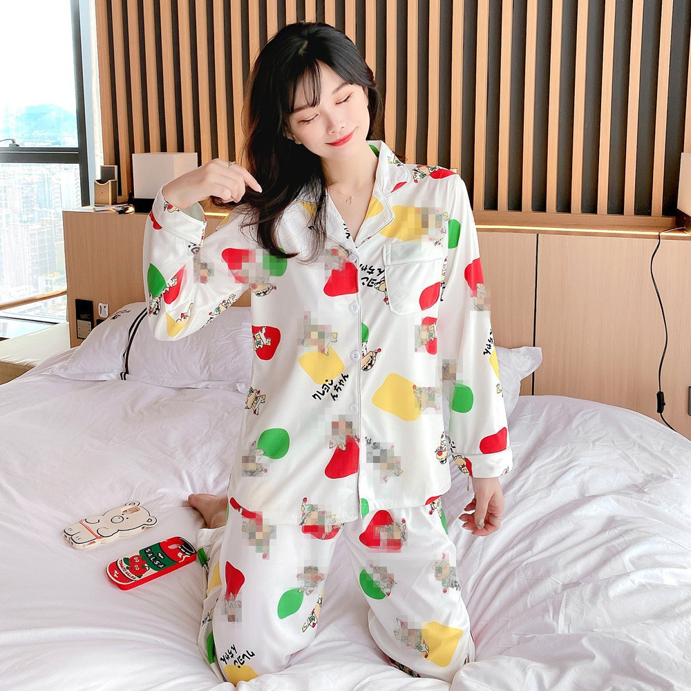 봄 가을과 겨울 새로운 잠옷 여자의 가디건 긴 소매 우유 실크 옷깃 느슨한 만화 달콤한 플러스 사이즈 가정 옷스토어 가기