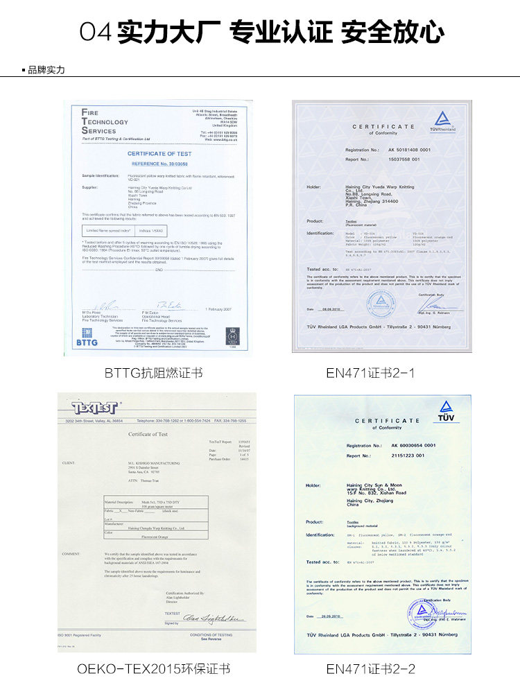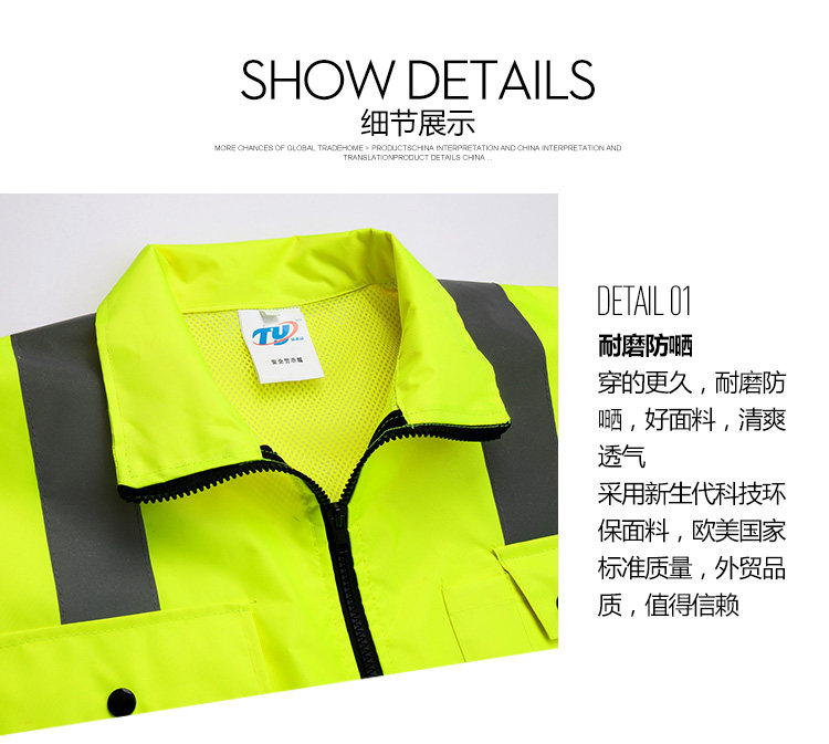 浙江天跃防护用品有限公司专业从事反光服装的设计与生产,有两家实体工厂,自建厂房,遵守国标GB20653、欧标EN ISO20471、美标ANSI/ISEA 107、澳标AS/NZS4602、加拿大 CSA Z96等质量标准,产品主销欧洲、北美、澳州等地区,本公司也是诸多国际知名反光服品牌的制造商,同时也为沃尔沃、阿拉酋航空等国外企业生产反光背心。 在国內,我们已为中国建筑、中石油、中铁、中国铁建、中国交通建设、中国电建、中船重工、中铝,宁波建工、国家电网、中国核建、中石油、万科等企业的旗下单位提供反光安全服。