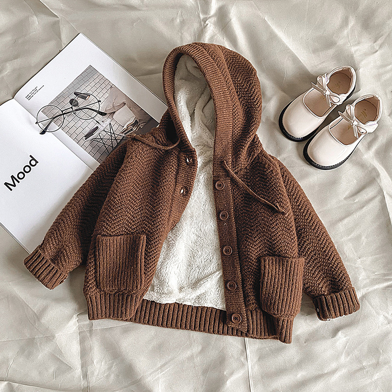 새로운 한국 스타일 니트 스웨터, 벨벳 안감 아동용 스웨트셔츠, 두꺼운 패셔너블한 아기 코트, 남아 여아용 후드 스웨터스토어 가기