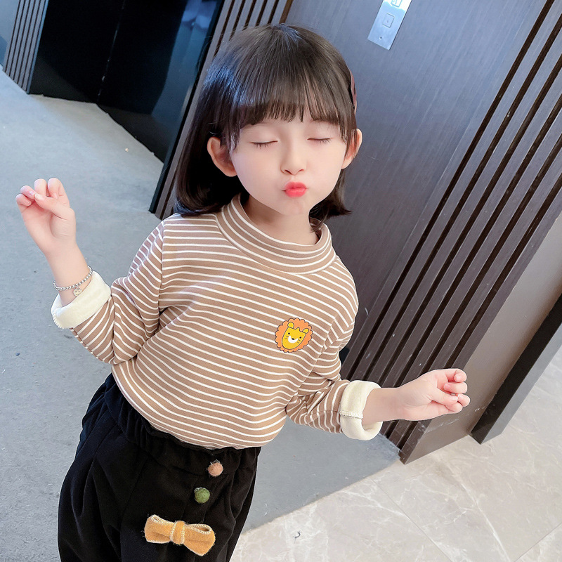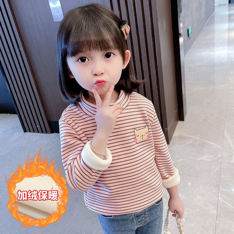 걸스 스트라이프 원피스 플리스 베이스 셔츠 2021 새로운 어린이 하프 하이 칼라 스웨터 어린이 두꺼운 따뜻한 탑 트렌디