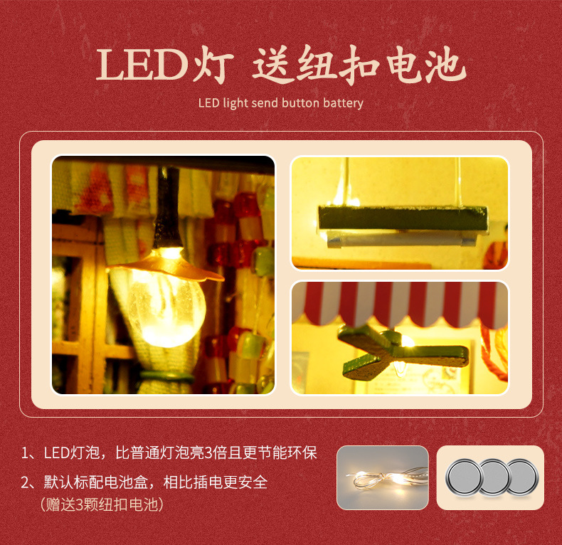 标配:LED灯+纽扣电池开关+1支白乳胶(产品不含工具及酒精胶,白乳胶是粘贴纸配件和木材的,其余的需要酒精胶,酒精胶是需要自行购买)