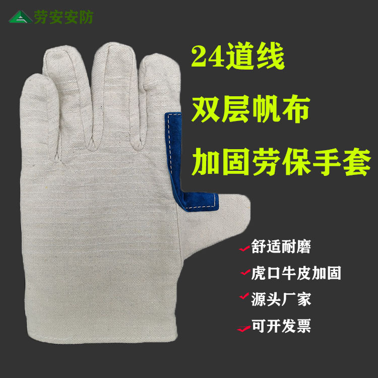 虎口加固帆布手套双层全衬24道线帆布手套 电焊维修耐磨加厚虎口加固帆布劳保手套