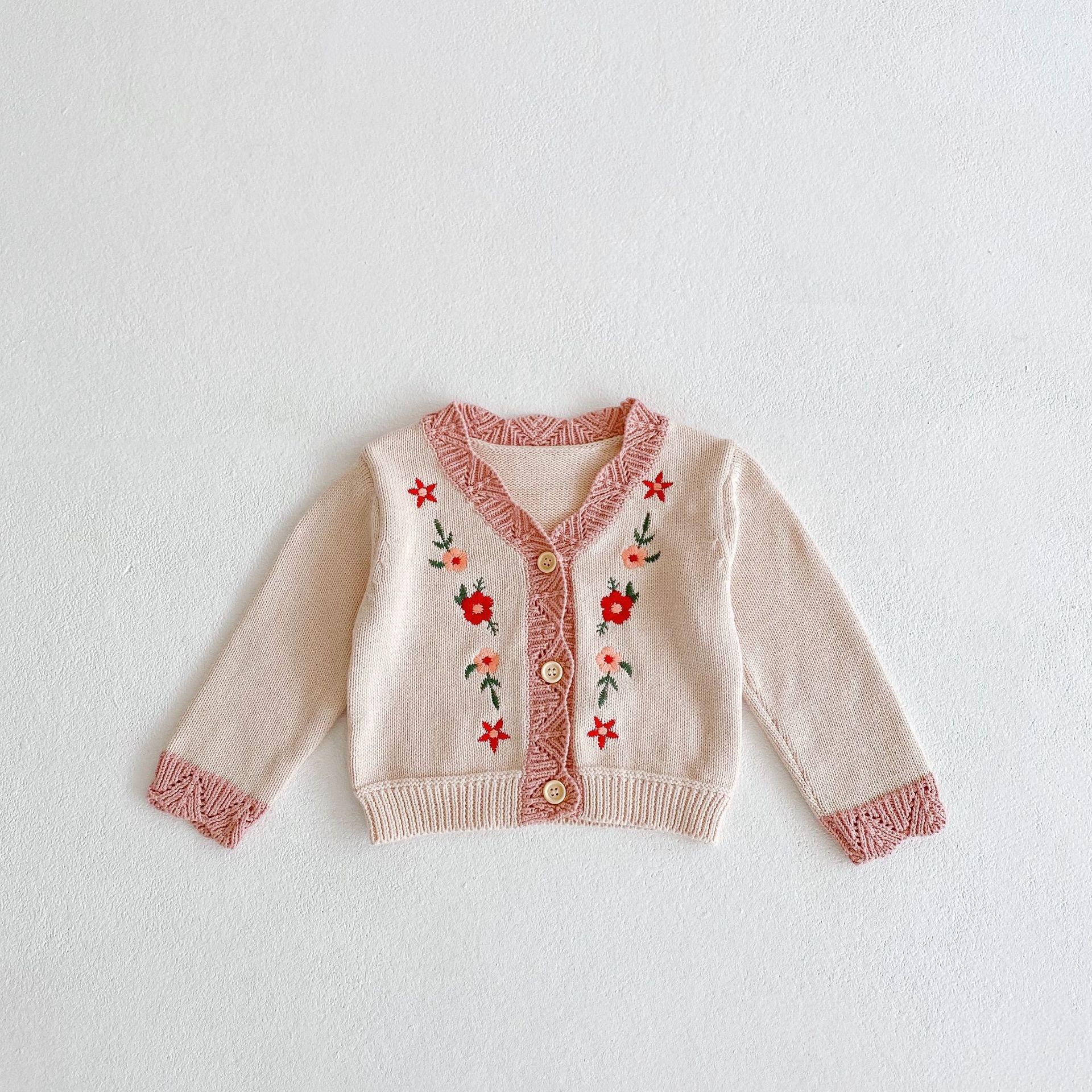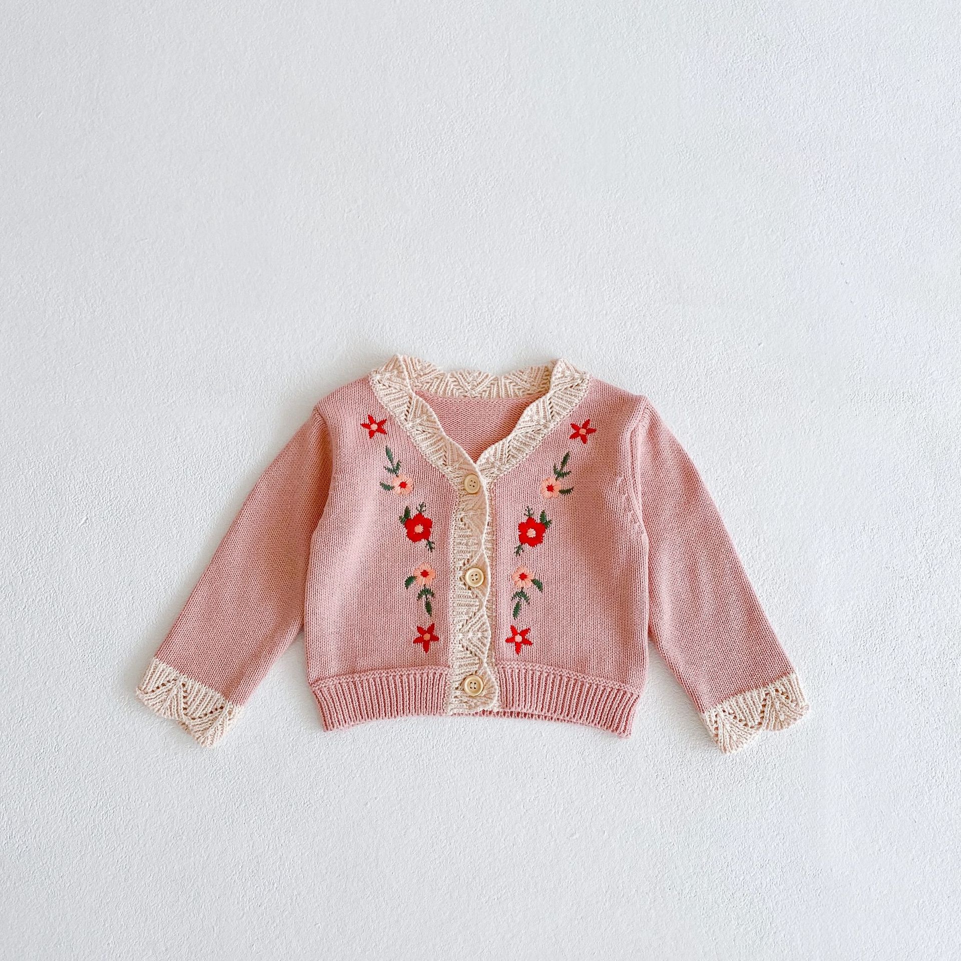 2025 가을, 겨울 다목적 유아 및 어린이 아기 소녀 코트 꽃 수 놓은 니트 스웨터 카디건 긴팔 탑