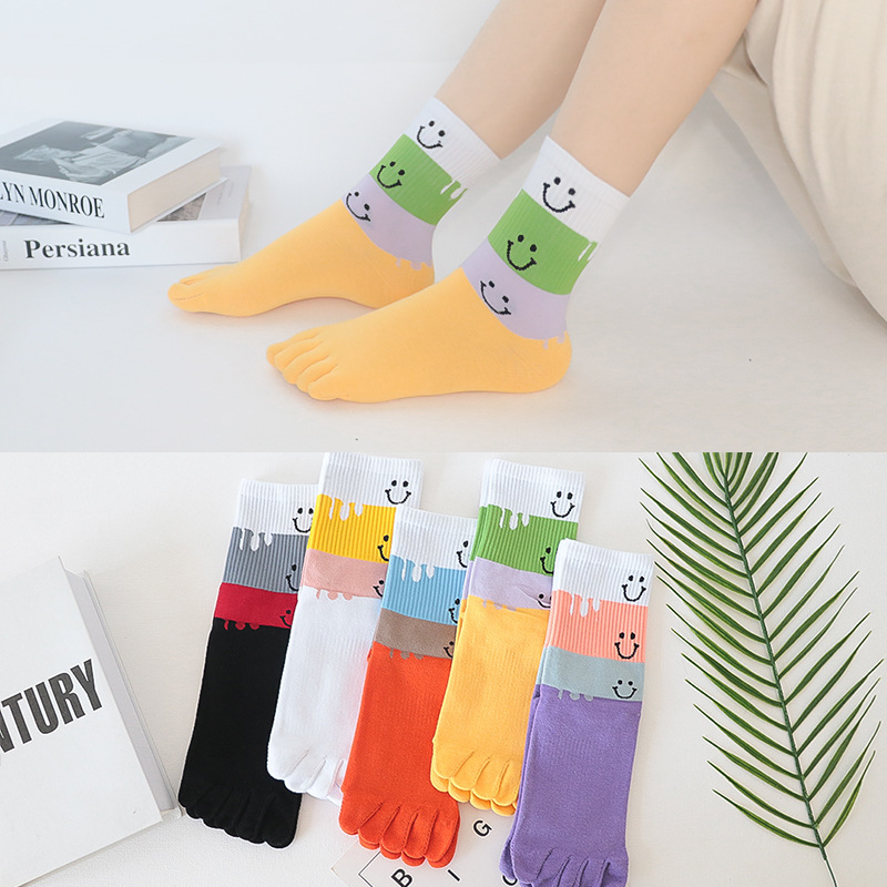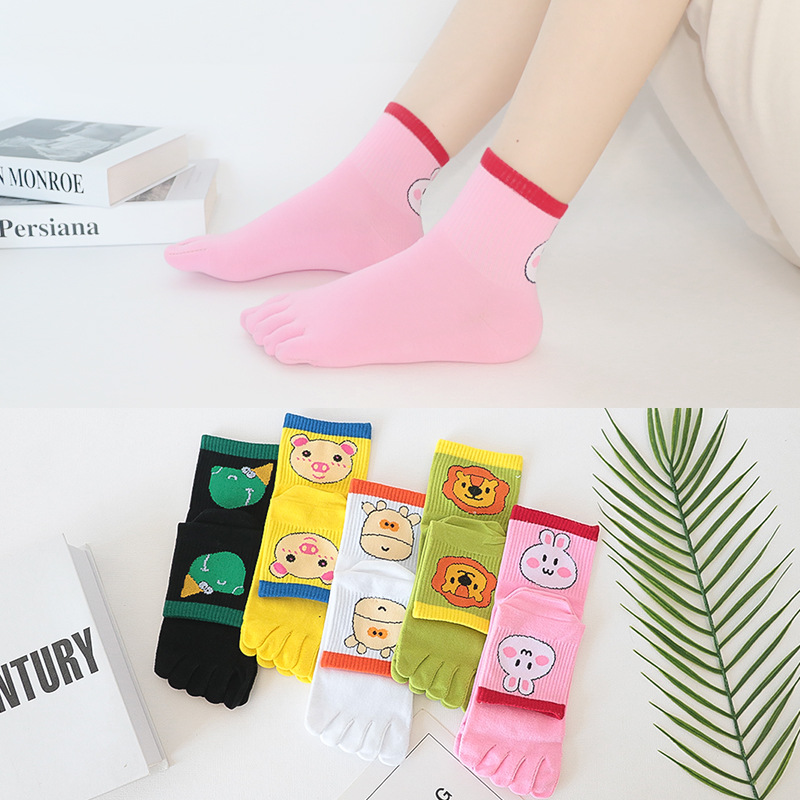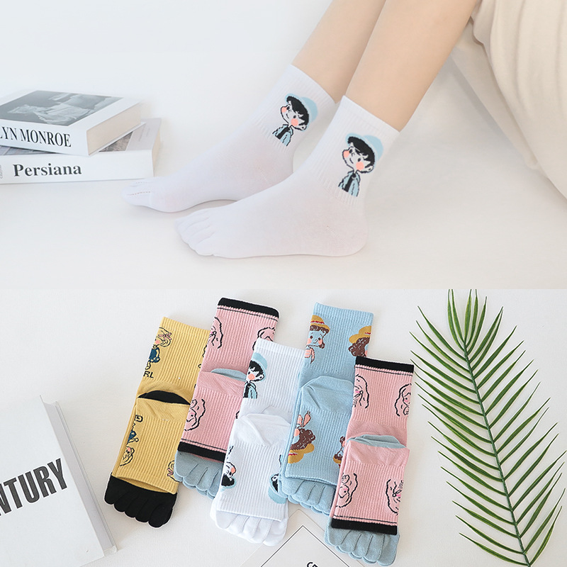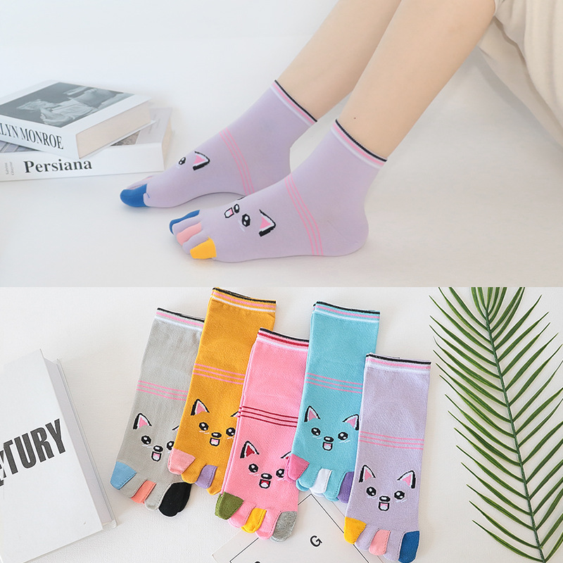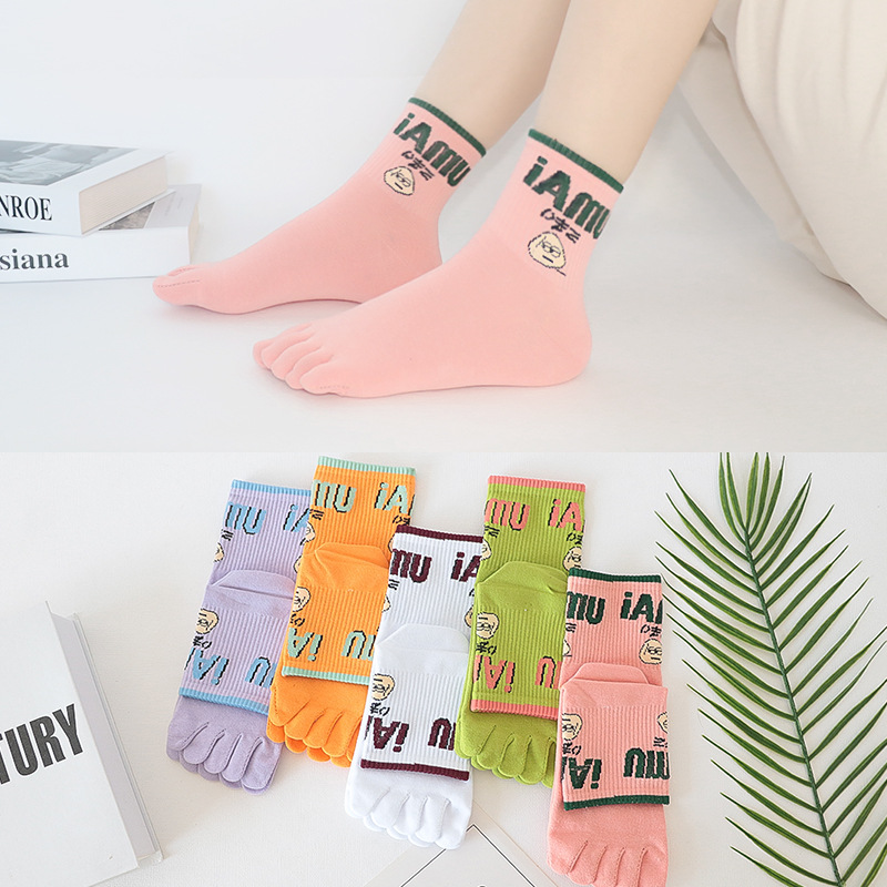 다섯 손가락 양말 여성 단색 면사 탈취제 봄과 가을 얇은 튜브 만화 귀여운 색상 높은 튜브 발가락 양말 도매스토어 가기
