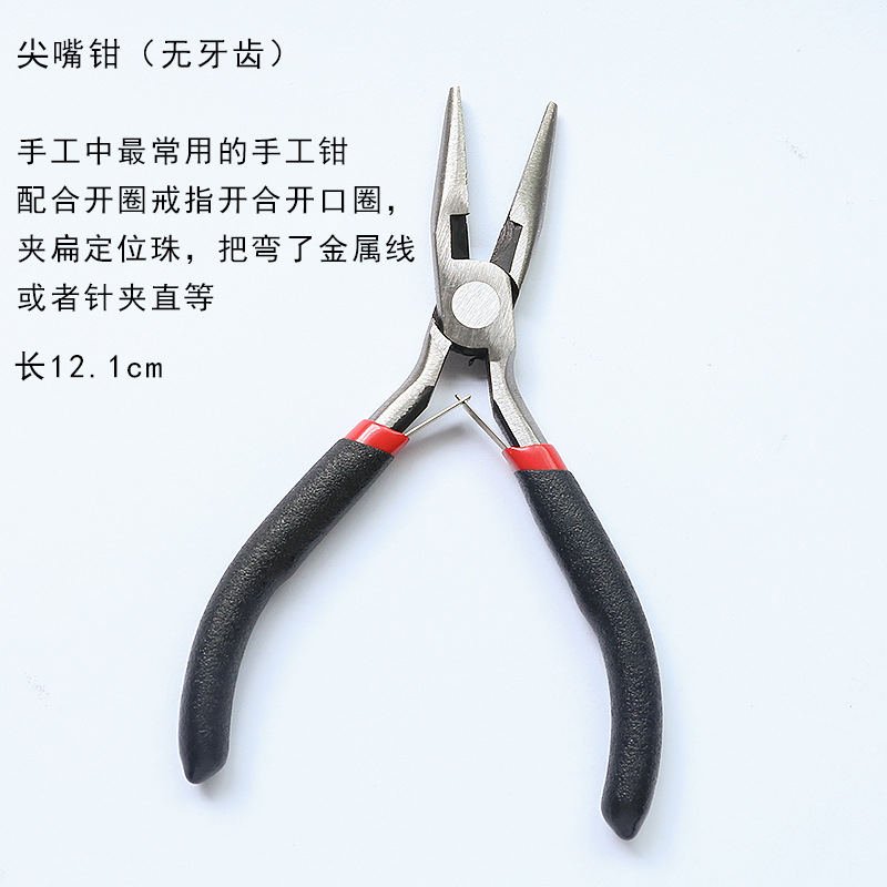 尖嘴钳(无牙齿)作用:生活中常用的手工钳,配合开圈戒指开合开口圈,把弯了的金属线或者针夹直等。