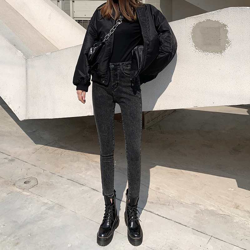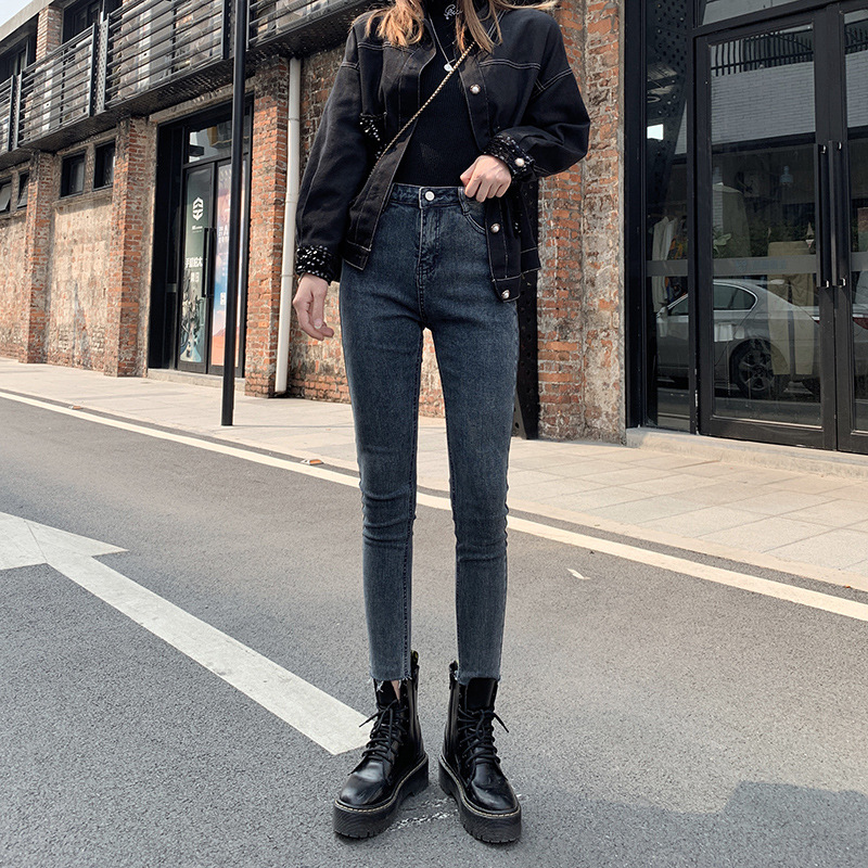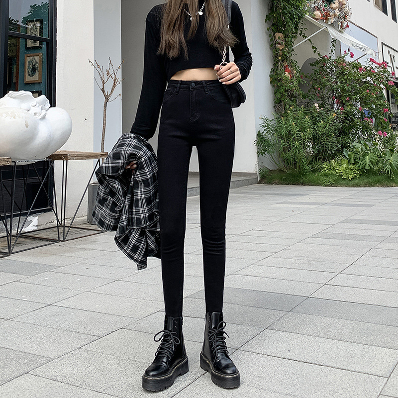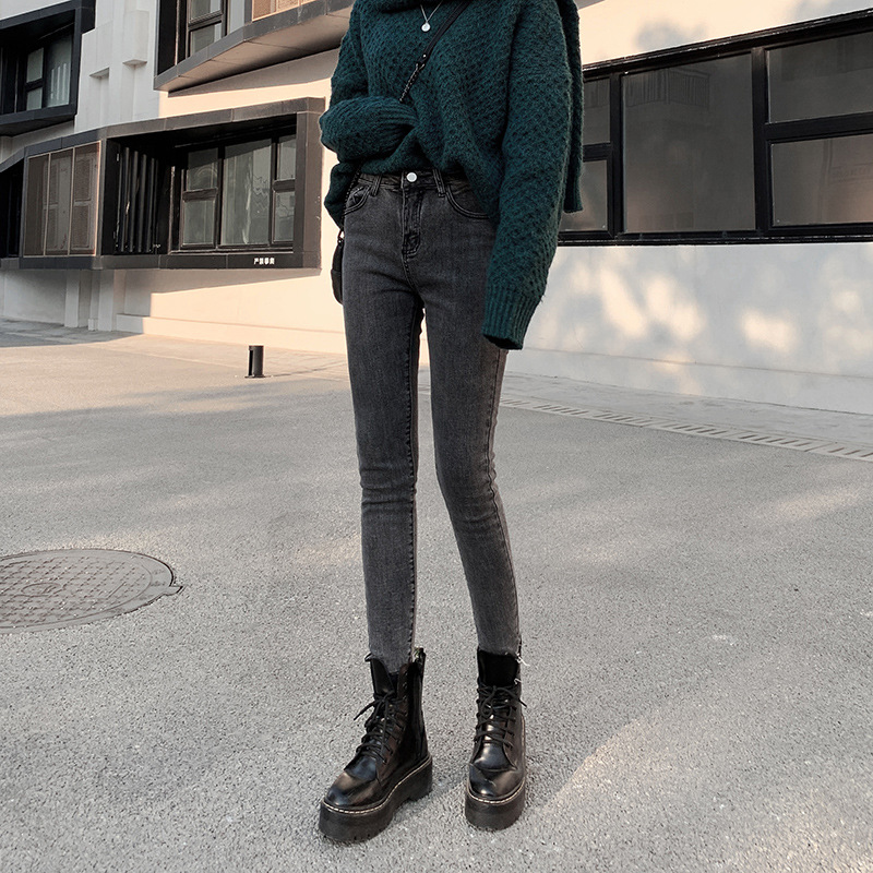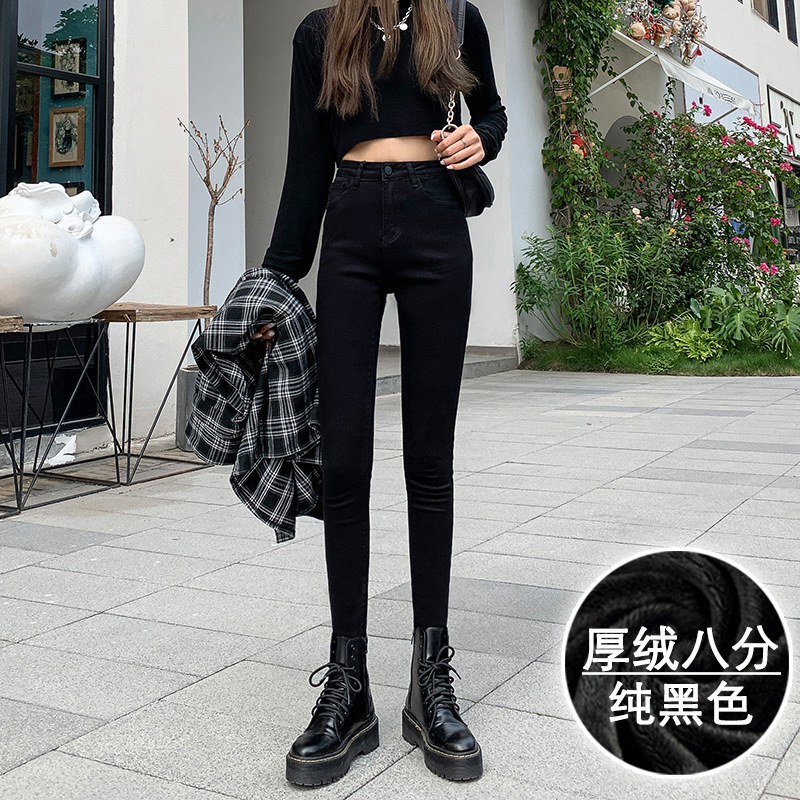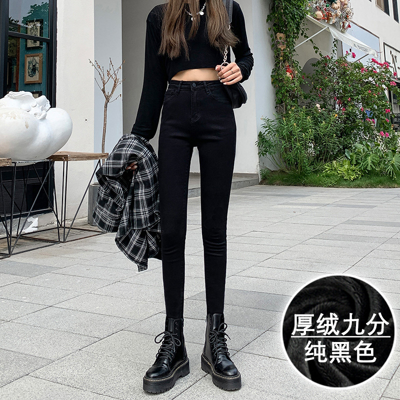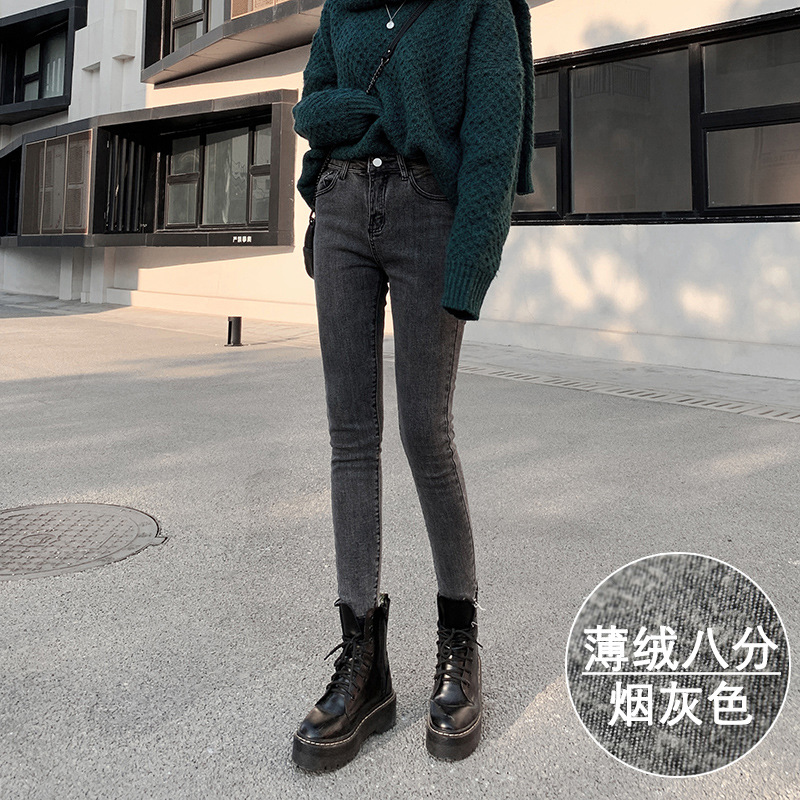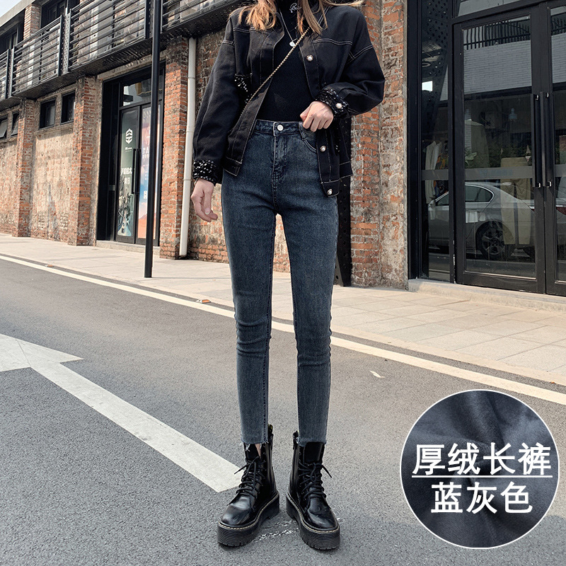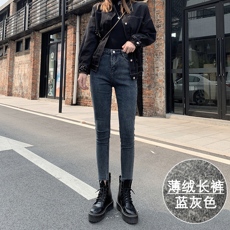 2023 그레이 블랙 청바지 여자의 봄과 가을 하이 웨이스트 슬리밍 꽉 발 새로운 가을 바지 얇은 벨벳 기모스토어 가기