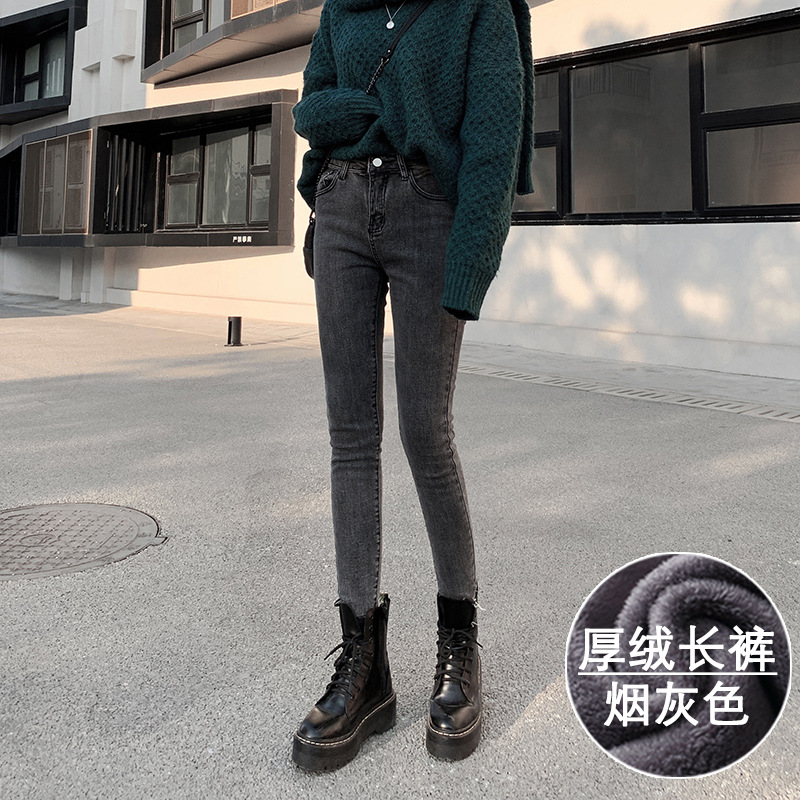 2023 그레이 블랙 청바지 여자의 봄과 가을 하이 웨이스트 슬리밍 꽉 발 새로운 가을 바지 얇은 벨벳 기모