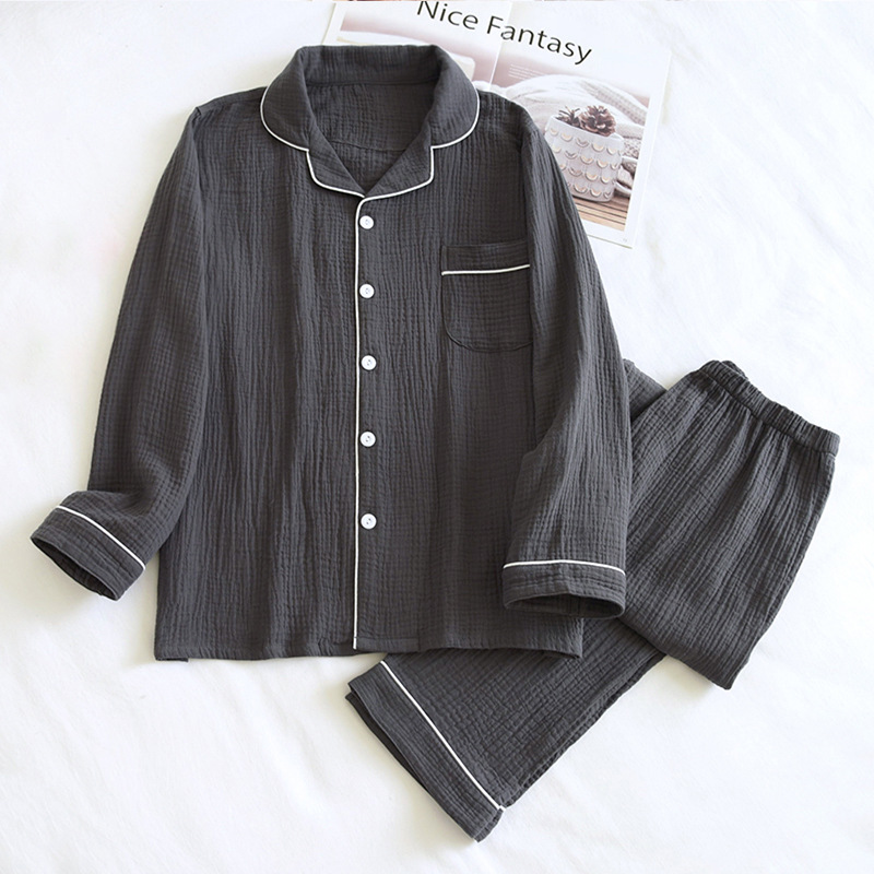 공장 직공급 면 남성 잠옷 세트 느슨한 봄과 가을 더블 거즈 플러스 사이즈 면 크레이프 긴 소매 도매
