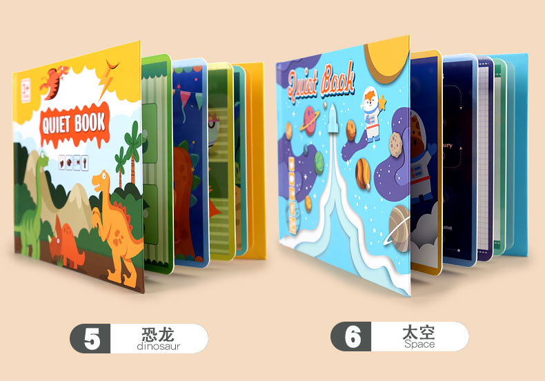 书本式安静粘贴书共10款,每款5页配带魔术贴,小号安静粘贴书2款,具体产品规格及箱规如下: