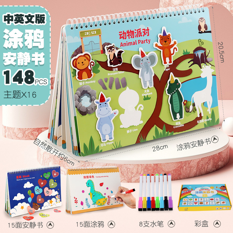【套餐14】涂鸦款台历式安静粘贴书:尺寸:30*21.5*3.3cm 重量:0.68KG 装箱数:28套一箱 装箱尺寸:49.5*32*45cm