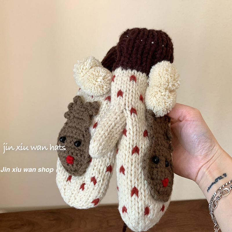 한국 스타일 엘크 크리스마스 장갑 귀여운 기모 두꺼운 수제 양모 겨울 따뜻한 목 장갑 여학생스토어 가기