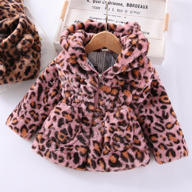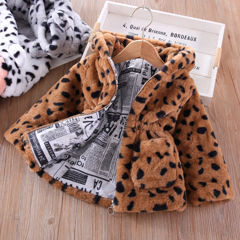 어린이 코트 2021 가을 새로운 한국 소녀 레오파드 무늬 모피 코트 어린이 후드 따뜻한 코트