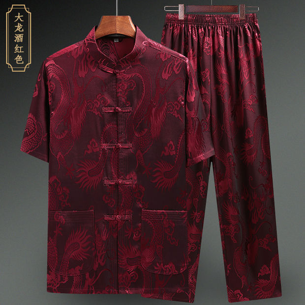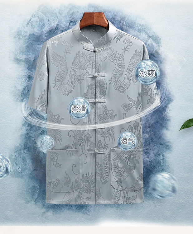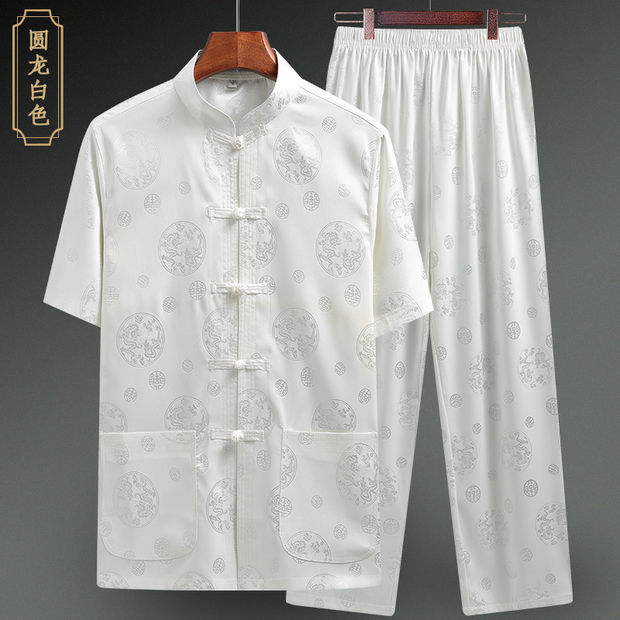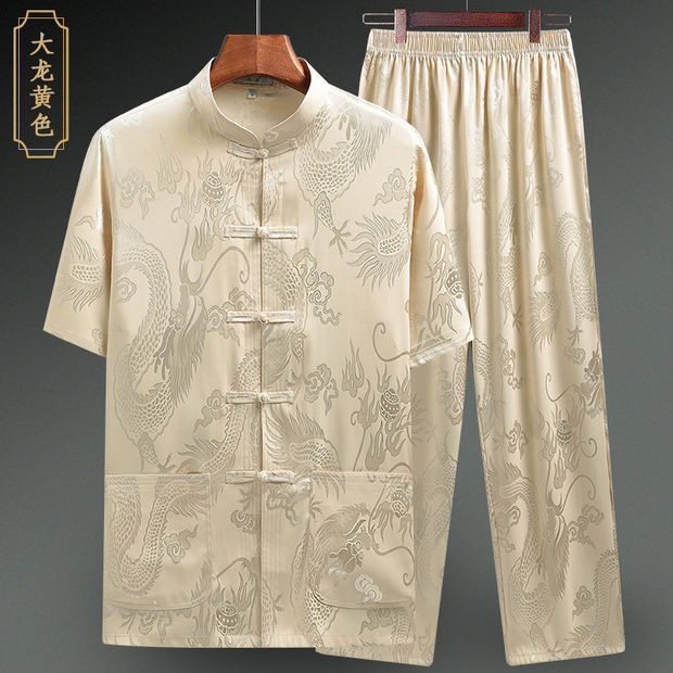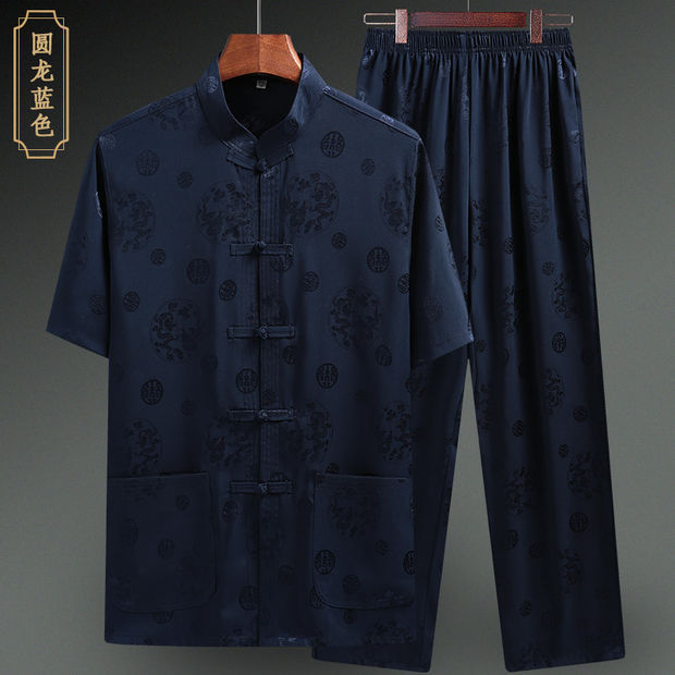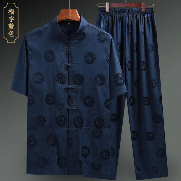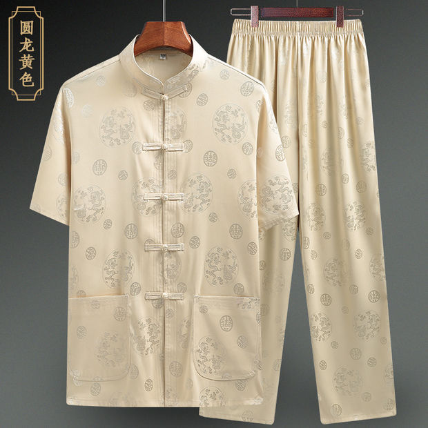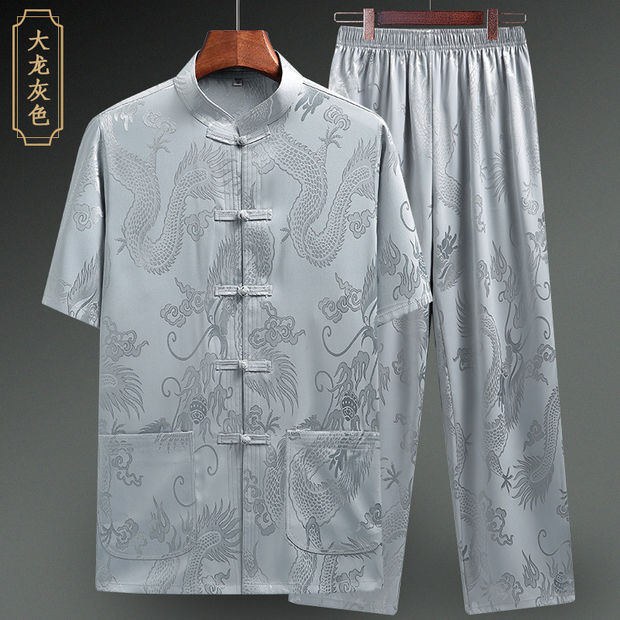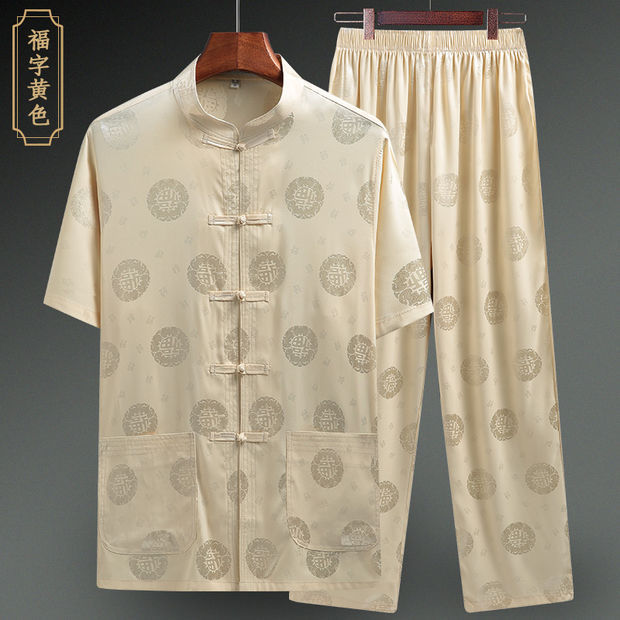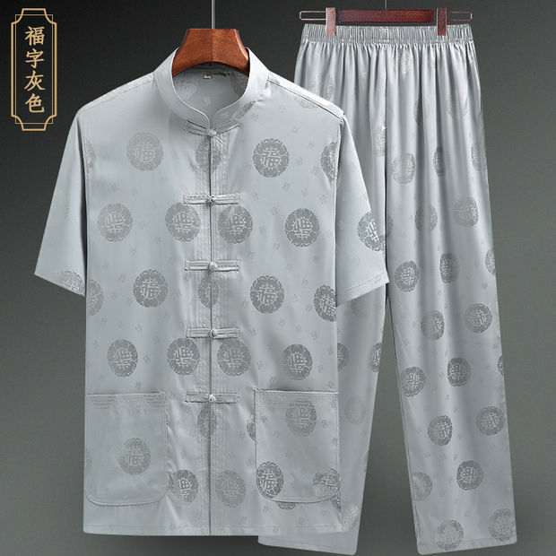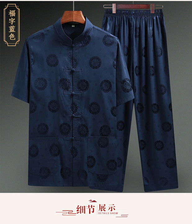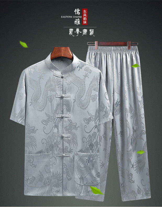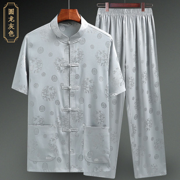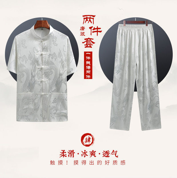 Tang 세트 남자의 아이스 실크 반팔 여름 중년 및 노인 아빠 세트 얇은 세트 노인 옷 중국 스타일 할아버지 여름 옷